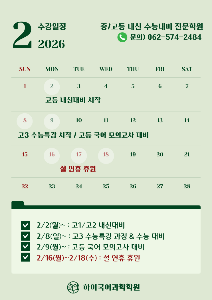 하이국어과학학원 2월 수강일정 안내문 안녕하세요. 하이국어과학학원입니다. 새해를 맞이한 때가 어제의 기억처럼 선명한데 한 달이 훌쩍 지나 2월이 되었습니다. 다들 새해 목표 잘 이루고 계신가요? 하이학원의 학생들도 새해 공부 목표에 따라 열심히 공부하며 1월을 보냈습니다!❤️ 특히 1월에는 3주 국어 특강이 있었는데요, 모두들 열심히 잘 따라와줘서 수고했고 잘했다고 말해주고 싶습니다. 고통 없는 대가는 없다는 말처럼 힘들게 노력한 만큼 좋은 성과가 있을 거예요. 이 열정, 이 기운 그대로 가지고!! 2월도 하이학원과 함께 열심히 달려봅시다. • 2/2(월) : 고등 내신대비 시작 • 2/8(일) : 고3 수능특....... <img src="https://blogthumb.pstatic.net/MjAyNjAyMDZfMTg5/MDAxNzcwMzAzOTA1ODE4.lR0gWl7LhPJUejH8p-YwQf2QaqwmbcOxRafUtqkI-icg.NK_1EOhXianWXkh5dw_2ti-6r2ssyW7O3pV4dy2NFtog.PNG/2026_2%BF%F9_%BC%F6%B0%AD%C0%CF%C1%A4.png?type=s3" />
