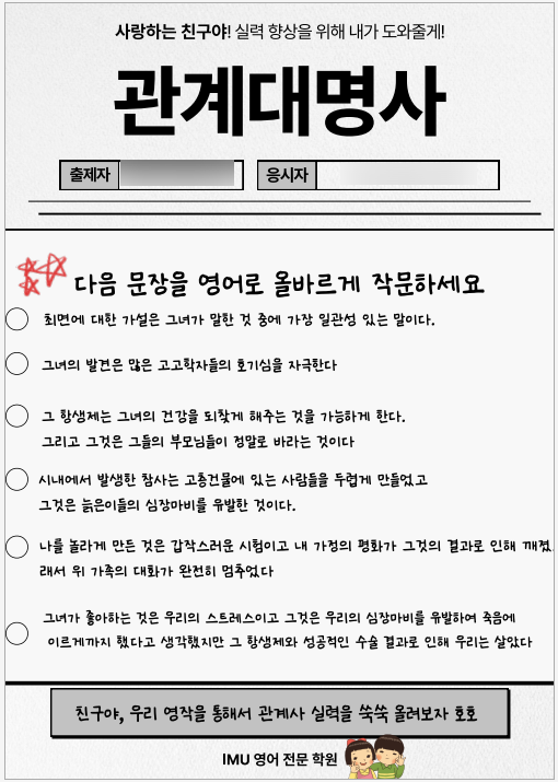 안녕하세요 IMU 입니다. 모두 설 연휴 잘 보내셨나요? 저는 학생이 세배를 하고 갔어요 초5 때 만난 아이가 중2가 되었는데 매년 세배를 하고 있다는 귀여운 이야기 오늘은 그룹핑 수업을 기록해볼게요 오래된 친구들끼리는 함께 공부해온지 3년차 정도가 되었는데, 그래서 그런지 서로 친해져서 으르렁 거리며 열심히 수업을 듣습니다. 우리 제발 우아하게 수업하자고 해도 그룹핑 수업이 끝나면 저도 10년씩 늙어요 ✅️ 최근에 관계대명사 회독을 했고 자료를 [고등]으로 업그레이드해서 진행중이에요 Honesty and intergrity are the principles which have guided me throughout my life 진실과 청렴이, 인생을 사는 동....... <img src="https://blogthumb.pstatic.net/MjAyNjAyMTVfMjc3/MDAxNzcxMTQ1NTA4NTc3.1OlxfZ0DRZb89TRE7mLuCeowKAYiVGIUz3Ht4OhIzN8g.H9w1mA1UjzrOW48q5Hlt9svZPMTtuN3AlyoOyI3waxog.PNG/image.png?type=s3" />