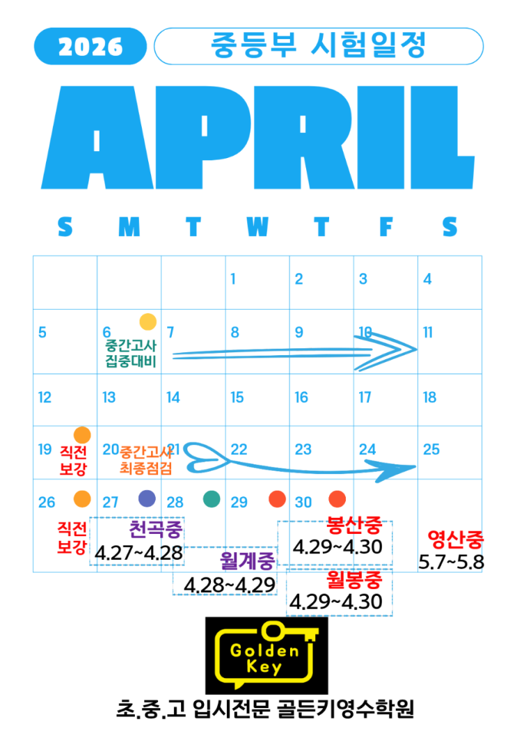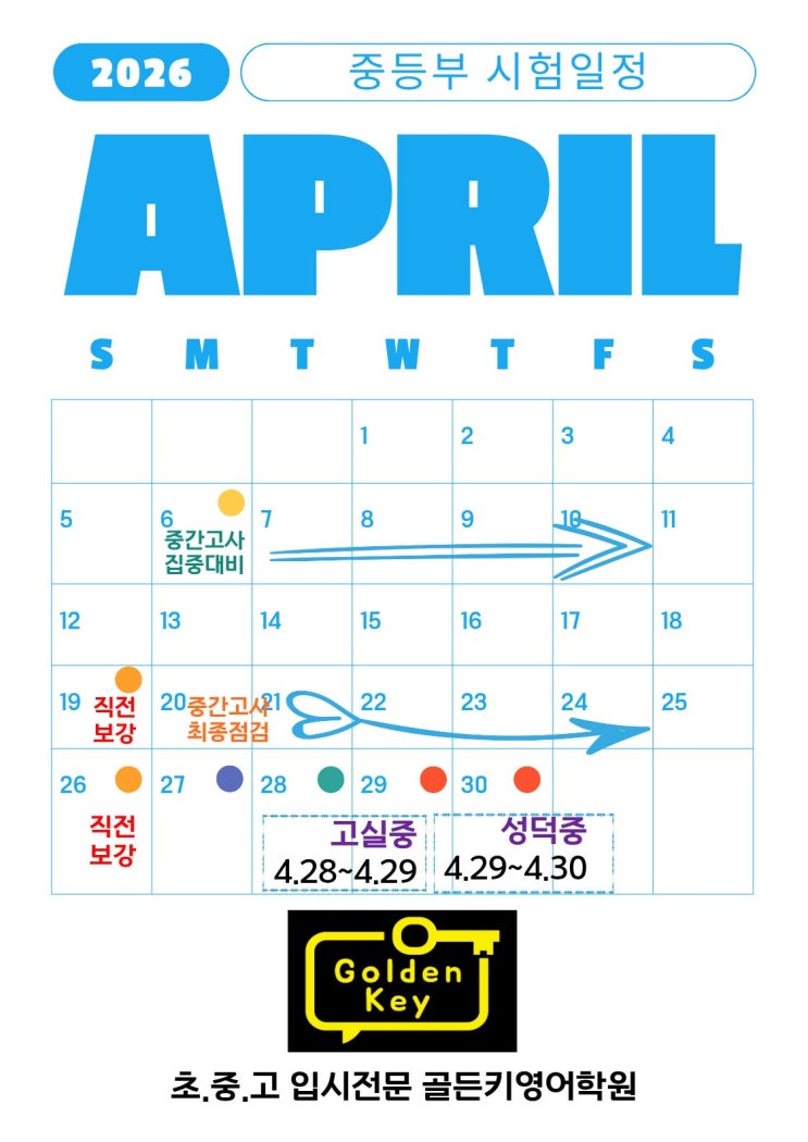 성덕중영어 · 고실중영어 중간고사 대비 시작 장덕동 골든키영어학원 4월 시험대비 일정 안내 안녕하세요. 장덕동 골든키영어학원입니다. 4월은 중학교 1학기 중간고사 준비가 시작되는 중요한 시기입니다. 특히 성덕중영어, 고실중영어 시험은 교과서 내용뿐 아니라 서술형, 어법갯수, 변형 문제의 비중이 점점 높아지고 있습니다. 그래서 단순 암기식 공부만으로는 90점 이상 안정적인 점수를 만들기 어렵습니다. 이번 글에서는 성덕중영어 · 고실중영어 중간고사 대비 일정과 준비 전략을 안내해드리겠습니다. 성덕중 · 고실중 4월 중간고사 일정 2026년 4월 시험 일정은 다음과 같이 예상됩니다. 고실중 : 4월 28일 ~ 4월 29일 성덕중 : 4월....... <img src="https://blogthumb.pstatic.net/MjAyNjAzMTZfMjk4/MDAxNzczNjM3NzAxMzk0.g5J8L_FVoegq0SNV_zAKN4OOQSuqTKJaSVHyo6xQzL8g.jXUmPHxCmooRzwmSQa-M_6Di78rRs0OzEVQWc1C6iJAg.JPEG/2.jpg?type=s3" />