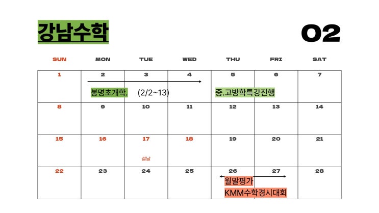 강남수학학원 2월일정입니다 봉명초 2주개강입니다 원신흥초를 제외한 봉명 상원 6학년은 방학특강 19일 다시 시작합니다 26일 27일 초등 중등부는 KMM 경시대회있습니다 100점은 대상 90점 이상은 금상 80점이상은 은상 70이상은 동상 수여됩니다. 진지하게 문제푸는 모습이 기특하고 예쁘네요 방학특강은 초등부 5주특강 중등부 6주특강 고등부 8주특강 진행하고 있답니다 16일 17일 18일 설날연휴입니다 19일부터 정상수업합니다 26일 27일 KMM경시대회 개최합니다 그리고 월말평가 실시합니다 월말평가 80점미만은 통과할때까지 재시험 본답니다 열심히 하는 강남수학 친구들 응원합니다 <img src="https://blogthumb.pstatic.net/MjAyNjAxMjlfMTkx/MDAxNzY5Njg2MzA4Njk2.DBiNTpw0CoR7gs1mQU1D5Tg7HIt838YkscEkNZRszqEg.RWQRqdmitiGrrAdGkcdf3g7Kheow9OAndoZvuJebtSsg.JPEG/26%B3%E21%BF%F9%C0%CF%C1%A4.jpg?type=s3" />