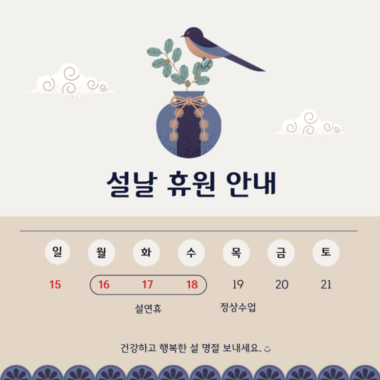 안녕하세요! 에이프릴 음악학원입니다. 2월 16일(월) ~ 18일(수) 설 연휴로 휴원합니다. 2월 19일(목)부터 정상 수업으로 진행됩니다. 성인 수강생 및 연습실 대여자분들의 연습실 이용은 정상적으로 가능합니다. 연휴 기간이 긴 만큼 연습실 이용 후에는 ✔ 문단속 ✔ 전원 차단 ✔ 불 소등 등을 꼭!!!한 번 더 확인해 주시길 부탁드립니다. 모두 즐겁고 따뜻한 설 연휴 보내세요 상담문의 010.2616.4028 #송촌동 #송촌동피아노 #송촌동피아노학원 #송촌동음악학원 #송촌동성인피아노 #대전피아노 #대전음악학원 #대전피아노학원 #대전성인피아노 #법동피아노 #법동음악학원 #중리동피아노 #중리동음악학원 #중리동성인피아노 #대....... <img src="https://blogthumb.pstatic.net/MjAyNjAyMTBfMTgg/MDAxNzcwNzE3MjA1NzQx.3fbm0gj1v81OWZ79Bs6KQvM2OKBX2Rk-zo3YDcNNym4g.VwVCDYpUS1gnp4d3PONzSfoc63CViYlzO0rHWJsSjdkg.PNG/900%A3%DF%BA%A3%C0%CC%C1%F6%BB%F6%A3%DF%C7%D1%B1%B9%C0%FB%C0%CE%A3%DF%BC%B3%A3%DF%B8%ED%C0%FD%A3%DF%C8%DE%B9%AB%A3%DF%BE%C8%B3%BB%A3%DF%C0%CE%BD%BA%C5%B8%B1%D7%B7%A5.png?type=s3" />