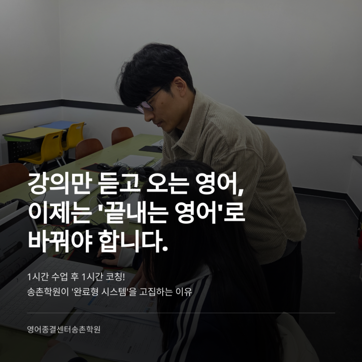 "학원 문을 나서는 순간, 진짜 공부가 시작됩니다" 안녕하세요, 송촌동영어학원의 새로운 학습 패러다임을 만드는 영어종결센터 송촌학원입니다. 보통 학부모님들은 아이가 학원에 앉아 있는 시간만큼 실력이 늘 것이라고 믿으시죠? 하지만 22년 경력의 베테랑으로서 단호하게 말씀드리고 싶어요. 단순히 강의만 듣고 오는 아이의 머릿속에는 배운 내용의 10%도 남지 않는답니다. 송촌학원이 1시간의 본 수업 후, 반드시 1시간의 '마스터 코칭'을 붙여 그날 배운 것을 끝내게 만드는 이유가 바로 여기에 있어요. [1단계] 본 수업(Teaching): 언어의 구조를 관통하는 원장 직강 먼저 송촌동영어학원 영어종결센터송촌의 원장....... <img src="https://blogthumb.pstatic.net/MjAyNjAyMTZfMTI3/MDAxNzcxMjA5MzgzMjQ3.jj-RvRzonPwQgNhgcvQ3i02yfDY_-GId0Il5OGGqcZkg.lDCg_h9snBtGcwC7t2T_ChzxZPFKhf8BLGbtSMX4tpIg.PNG/carousel-page-1_%283%29.png?type=s3" />