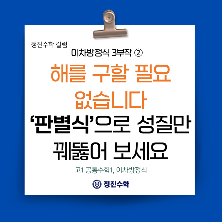 안녕하세요, 생각의 깊이가 다른 수학, 세종시 도담동 수학전문 정진수학입니다. 중학교 수학과 고등학교 수학의 가장 큰 차이점이 무엇일까요? 이차방정식을 기준으로 생각해보면, 중학교 때는 "방정식을 푸시오(근을 구하시오)"라는 문제가 주로 나옵니다. x의 값을 찾아내는 것이 목표였습니다. 하지만 고등학교 수학에서는 질문이 달라집니다. "이 방정식은 어떤 종류의 근을 가질까?", "그래프가 몇 개의 점에서 만날까?" 즉, 정확한 근의 값은 안 궁금한데, 그 근이 실수인지 허수인지, 2개인지 1개인지 그 '성질'만 알고 싶을 때가 훨씬 많아집니다. 이럴 때 굳이 복잡한 근의 공식을 끝까지 다....... <img src="https://blogthumb.pstatic.net/MjAyNjAyMjRfMzMg/MDAxNzcxOTIwMDQxMzg3.1wSlM4j2FZIYlJaBBOq5-mnnYCola8W0nyHCFuPCQl4g.JaNpRbchNOG68FoflP_hneKJuTnxzPka8mXcbcWT-p4g.PNG/%C1%A4%C1%F8%BC%F6%C7%D0_%C4%AE%B7%B3_-_%B0%F8%C5%EB%BC%F6%C7%D01_%C0%CC%C2%F7%B9%E6%C1%A4%BD%C4_3%BA%CE%C0%DB2.png?type=s3" />