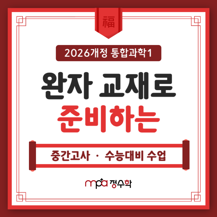 안녕하세요 수학, 과학 전문 학원 mpa정수학입니다. 2026 개정 교육과정이 적용된 통합과학1은 개념 이해는 물론, 문제 적용력까지 함께 요구되는 과목입니다. 특히 중간고사와 수능을 동시에 대비해야 하는 시점에서 어디서부터 어떻게 준비해야 할지 고민하는 학생들이 많습니다. 오늘은 완자 통합과학1 교재를 활용해 중간고사와 수능을 동시에 대비하는 수업에 대해 알아보겠습니다. 고난도 화학도 쉽게 풀린다?! 핵심 개념으로 완전정복! 통합과학1 화학 파트의 난관 통합과학1 중간고사에서 학생들이 가장 어려워하는 부분은 화학파트 문제들에 있죠. 통합과학1, 특히나 화학파트에서는 명확하고 쉬운 개념 이해와 문제 적용으로 단계별 고....... <img src="https://blogthumb.pstatic.net/MjAyNjAxMjdfNDcg/MDAxNzY5NDg0MTU5MzEy.WWd1AZtLKNlHRyxEaxkBcxY_tbrq0AaLyKiwbmOcyJEg.UiouG4GTnDnK8Fbl1OiCtd6_bkJxcscTaKgk_oktDYwg.PNG/%B4%EB%C8%EF%B5%BF_%B0%FA%C7%D0%C7%D0%BF%F8_%281%29.png?type=s3" />