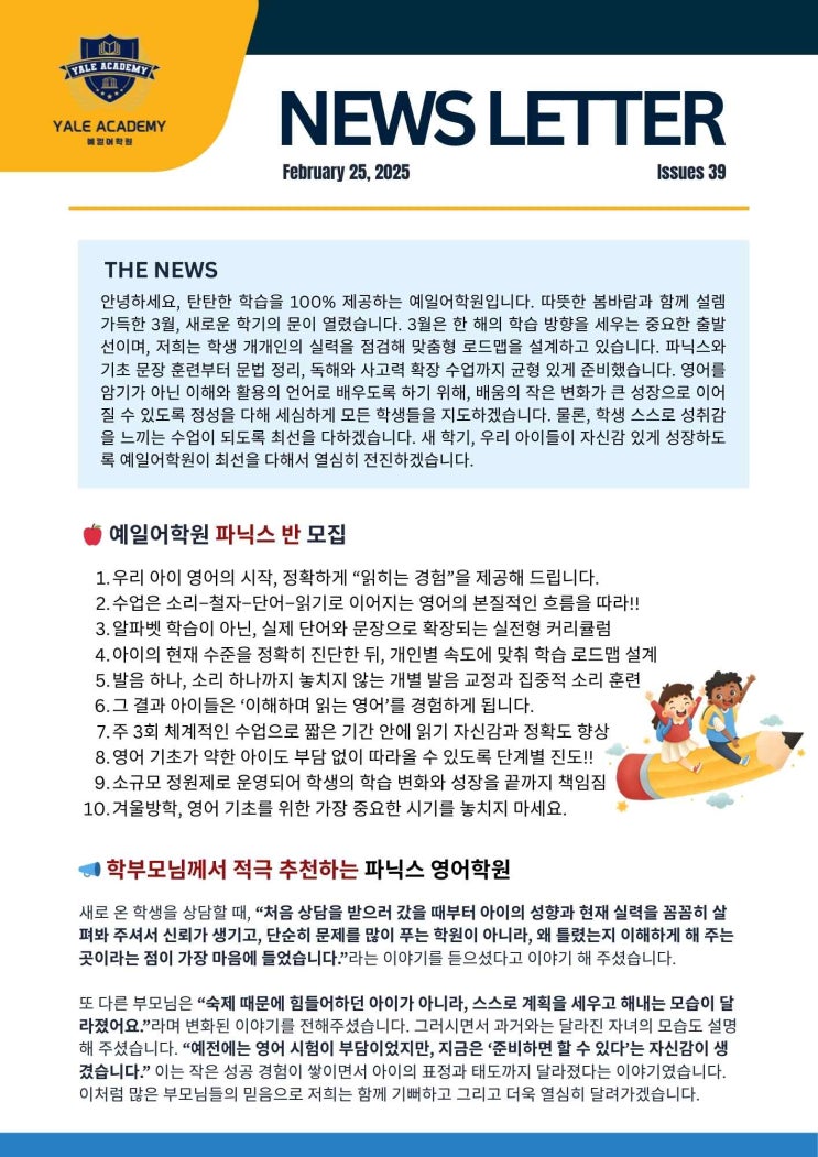 안녕하세요. 예일퀸입니다. 2026년도 3월 공지사항 안내드립니다. 따뜻한 봄이 오는 소리와 함께 새로운 학업의 시간이 본격적으로 시작되었습니다. 우선 저희 예일에서는 - 3월부터 초등부 파닉스 정규 프로그램이 새롭게 시작됩니다. 이 과정에서는 기초 발음과 읽기에 중점적으로 시간을 투자할 것이며 - 결과적으로는 학생들의 실력이 더욱 탄탄히 다져질 것으로 예상합니다. 또한 2월에 진행된 스피킹 대회에 4명의 학생들이 참석했습니다. 좋은 결과가 기대가 됩니다. 그리고 4월 고려대 스피킹 전국 대회를 목표로 심화 훈련과 집중 코칭이 이어질 것입니다. 신청하고자 하는 학생들은 미리 연락주세요. 또한 4월부터 본격적으로 동시통역....... <img src="https://blogthumb.pstatic.net/MjAyNjAyMjNfMTg0/MDAxNzcxODMxNjk5NDA1.iQMmZMgCW2og-Z_wVa98y26JamNmmjUbulbP4-zzUQIg.WBirjfzJ41ZdNxaj35ijh7EgY0Z90nB3xTIx2FBDHnQg.JPEG/1.jpg?type=s3" />