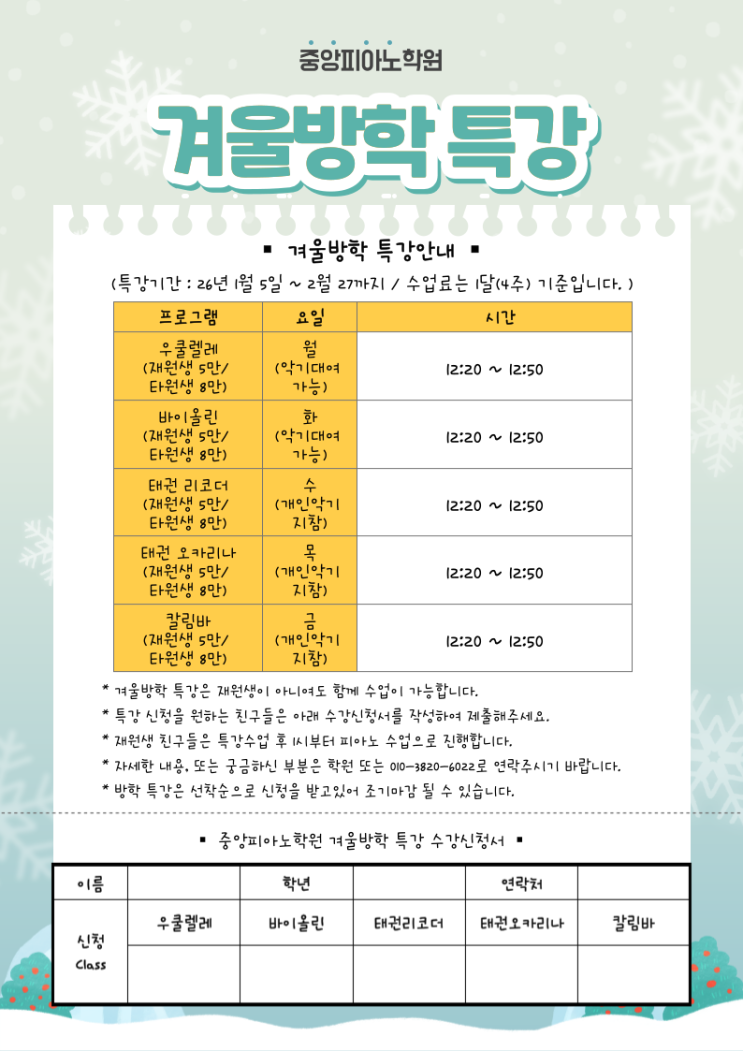 안녕하세요~ 중앙피아노학원 입니다.^^ 이제 아이들의 긴 겨울방학이 시작되었죠?! 방학 동안 새로운 악기에 도전해보세요! 겨울방학은 아이들이 새로운 경험을 하기에 가장 좋은 시기입니다. 중앙피아노학원에서는 피아노뿐만 아니라 다양한 악기를 경험할 수 있는 겨울방학 특강 프로그램을 준비했습니다 . 짧은 기간이지만, ✔ 음악적 흥미 UP ✔ 리듬감·집중력 향상 ✔ 새로운 악기 경험 을 목표로 알차게 진행됩니다. ⸻ * 겨울방학 특강 기간 • 2026년 1월 5일 ~ 2월 말까지 • 수업료는 1달(4주) 기준입니다. ⸻ * 특강 프로그램 안내 우쿨렐레 (월요일) • 재원생 5만 / 타원생 8만 • 악기 대여 가능 • 수업시간: 12:20 ~ 12....... <img src="https://blogthumb.pstatic.net/MjAyNjAxMDJfMSAg/MDAxNzY3MzYyNzk4Mjk5.Bg0QTePM9K37V7ZxHdM9vVFt-EEuDeXTxS92_Vf8VsUg.z65GO8Fou3wb6a1FhfatG8hzinvGneuEKayaOlpFJ0Ag.PNG/%C1%A6%B8%F1%C0%BB%A3%AD%C0%D4%B7%C2%C7%D8%C1%D6%BC%BC%BF%E4%A3%DF%A3%AD001%A3%A822%A3%A9.png?type=s3" />