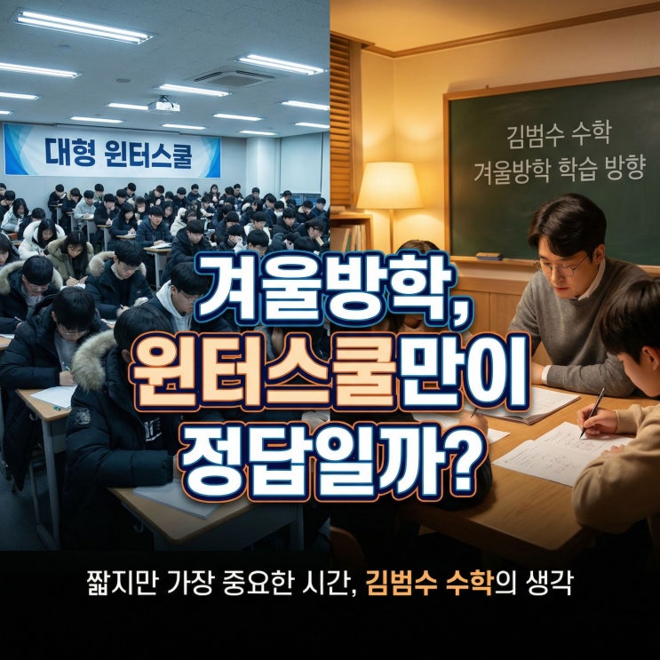 안녕하세요. 수학이 만드는 세상 원장 김범수 수학입니다. 요즘 겨울방학을 어떻게 보내고 계신가요? 이 시기가 되면 많은 학생들이 ‘윈터스쿨’이라는 이름 아래 대형 학원으로 향합니다. 그 모습을 볼 때마다 저는 늘 걱정이 앞섭니다. 겨울방학은 짧지만 학습의 방향을 바꿀 수 있는 가장 중요한 시간이기 때문입니다. 겨울방학을 ‘수박 겉핥기’로 배우며 보내기엔 너무 아까운 시간입니다. 솔직히 말씀드리면, 많은 윈터스쿨 수업은 겉보기엔 공부처럼 보이지만 실제로는 공부가 되지 않는 경우가 많습니다. 특히 수학은 다른 과목과 전혀 다릅니다. ✔ 학생마다 모르는 단원이 다르고 ✔ 헷갈리는 개념도 다르고 ✔ 막히는 이유도 전부 다....... <img src="https://blogthumb.pstatic.net/MjAyNjAyMDFfODcg/MDAxNzY5OTUwMDUxNDU2.Lj1IR2vmfrw4MjHCaBEYvYEP-H3C5ub9OFqNWtOSgIEg.TUlPaRgetKQvc5pZ2kaDl17Z0b6o69SQW3BIUcdur-Ug.JPEG/AIDrawing_260130_b36f4fe3-9716-478d-9ecb-4da2192e9649_0_MiriCanvas.jpg?type=s3" />