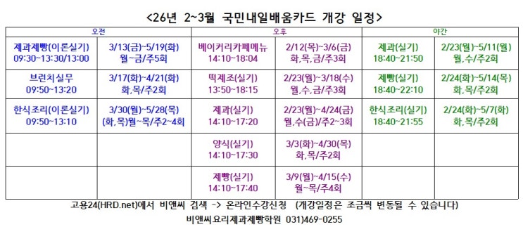 26년 국민내일배움카드 개강일정 입니다. 개강일정은 상황에 따라 조금씩 변동 될 수 있습니다. 궁금한 사항은 학원으로 전화주세요! <img src="https://blogthumb.pstatic.net/MjAyNjAyMTBfMTY5/MDAxNzcwNzAxNTk1NzEw.Eoj_FcyP5K08E9JmYscJtzd9JYpo9opWCmlcj9nXyIQg.KiKiAy-Oi42UW4PsawWIHzR9hJZQMqR0nAdUBISn2BUg.JPEG/23%BF%F9_%B0%B3%B0%AD%C0%CF%C1%A4.jpg?type=s3" />