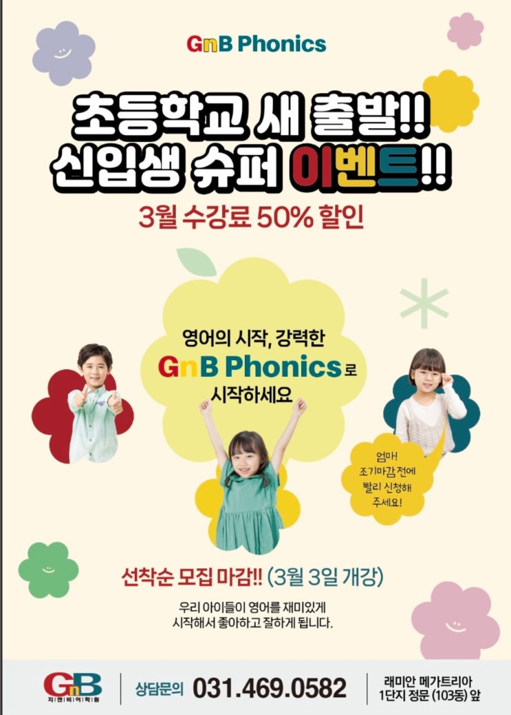 안녕하세요^^ GnB 안양캠퍼스입니다. 우리 아이가 영어를 처음 시작하는 순간, “재미있게 시작할 수 있을까?” “기초를 제대로 잡아줄 수 있을까?” 많이 고민되시죠? 그래서 준비했습니다. 예비초등 1·2 / 3·4학년을 위한 신규 Phonics Class 개설! 3월 3일(화) 개강 영어를 처음 시작하는 아이들에게 가장 중요한 것은 흥미 + 정확한 기초입니다. GnB 안양캠퍼스는 ✔️ 파닉스 소리 훈련 ✔️ 읽기 기초 다지기 ✔️ 자신감 형성 을 중심으로 수업을 진행합니다. 처음이라 더 즐겁게, 처음이라 더 탄탄하게 시작합니다. 신규 개설 Phonics Class (3월 한정 50% 할인) 예비초등 1·2학년 Phonics (1) 2:30 ~ 3:20 (2) 3:3....... <img src="https://blogthumb.pstatic.net/MjAyNjAyMTFfMTYw/MDAxNzcwNzk3MjU5Mjc0.3bBlmOOC1XkT2VbP9qhppDeUs5V4BQEzX0DypO7vxxAg.OZ_lWzmTW4OzpJ9kyZA3VWzTU_SQUA8vNdLy2jOgMDAg.JPEG/IMG_8938.jpeg?type=s3" />