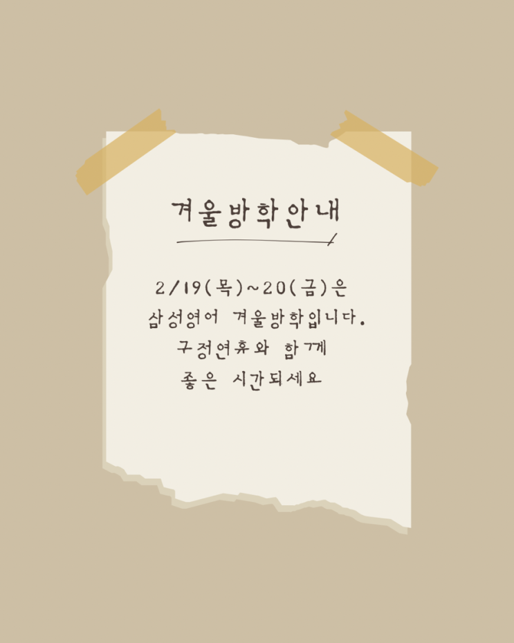 석수동 삼성영어 겨울방학 안내입니다. 올해는 구정 연휴 전후로 겨울 방학 여행 계획이 많으세요. 삼성영어에서는 구정과 함께 19일 (목), 20일(금)입니다. 즐거운 연휴 보내세요. <img src="https://blogthumb.pstatic.net/MjAyNjAyMTFfOTQg/MDAxNzcwODA4MTE2MzQy.kgDtDdK4RAhrd4aTIPybz5H0aiXsyJHE8KfxsjLSZKwg.Mvk_GsB-Fh_fL5KT7nPIW5ljDZKUEOsJVrF3AXdk6iEg.PNG/%BA%A3%C0%CC%C1%F6_%BE%C6%C0%CC%BA%B8%B8%AE_%B4%DC%BC%F8%C7%D1_%B0%F8%C1%F6%BB%E7%C7%D7_%C0%CE%BD%BA%C5%B8%B1%D7%B7%A5_%B0%D4%BD%C3%B9%B0.png?type=s3" />