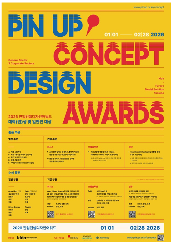 2026 핀업컨셉디자인어워드 ● 참가 자격 - 출품 자격 : 대학(원)생 및 일반인 - 개인 또는 팀(2인 이내)으로 출품 가능 - 일반인: 개인 또는 팀으로 연구한 순수 컨셉 디자인만 출품 가능 ● 공모 주제 [A] - 제품 산업 부문 - 전기, 전자, 디지털, 가구, 모빌리티, 리빙, 조명, 아웃도어, 스포츠, 의료, 산업기기, 패션, 미용, 반려동물 등의 산업 전 분야에 해당하는 제품 디자인 [B] - 커뮤니케이션 미디어 산업 부문 - 브랜드, 패키지, 인쇄, 광고, 캠페인, 영상, 디지털 미디어, 서비스, 경험디자인 등 커뮤니케이션을 목적으로 하는 디자인 [C] - 공간 및 환경 산업 부문 - 건축, 인테리어, 전시, 환경, 공공, 경관, 커뮤니티 디자인 등 공....... <img src="https://blogthumb.pstatic.net/MjAyNjAxMjlfMjky/MDAxNzY5NjcwNjk0MjYw.RJhXIZiQfJxk_X9RfkUwf5zTgEJZ7Eyn5bO2ASDdFyEg.m_x6QYgw13gF4AyDQbCn6QSXeCzx_-6Ft3lxCsTUkaog.PNG/image.png?type=s3" />