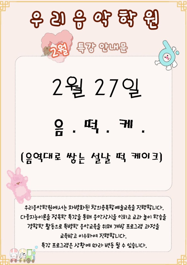 안녕하세요:) 우리음악학원 입니다. 한 달에 한 번, 우리음악학원에서는 특별한 음악특강 수업을 진행합니다. 2월 27일(금) 음.떡.께 2월에도 알차고 유익한 수업이 되길 바라봅니다. <img src="https://blogthumb.pstatic.net/MjAyNjAyMDVfNDYg/MDAxNzcwMjU3MTA1ODI4.w1ipqPdvbEk1MZuSxfdnRV6NMlHaegnpjgFkWH6I1h8g.U5ko6y17b8be7ur7_HprI4TKIMRX6lHPPVxJ6GOYu3gg.JPEG/2%BF%F9%BE%C8%B3%BB%B9%AE.jpg?type=s3" />
