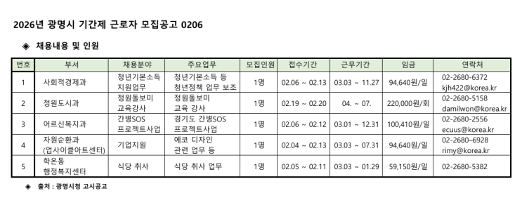 2026년 광명시 기간제 근로자 모집공고 0206입니다. 관심있신 분들은 광명시청 고시공고에서 확인할 수 있어요. 사진을 클릭하면 크게 보실 수 있습니다. 자세한 사항은 광명시청 홈페이지를 참고하세요. <img src="https://blogthumb.pstatic.net/MjAyNjAyMDZfOTgg/MDAxNzcwMzUyMzk2NzE0.r5QcjDssje0zlozrP34HS5HuEmbwGaPJhZimG8DhWT4g.6vg4YgUe_IqFkpQALyTgqTE_pl6TGZprFYQApVfqpbgg.PNG/2026%B3%E2_%B1%A4%B8%ED%BD%C3_%B1%E2%B0%A3%C1%A6_%B1%D9%B7%CE%C0%DA_%B8%F0%C1%FD_0206.png?type=s3" />