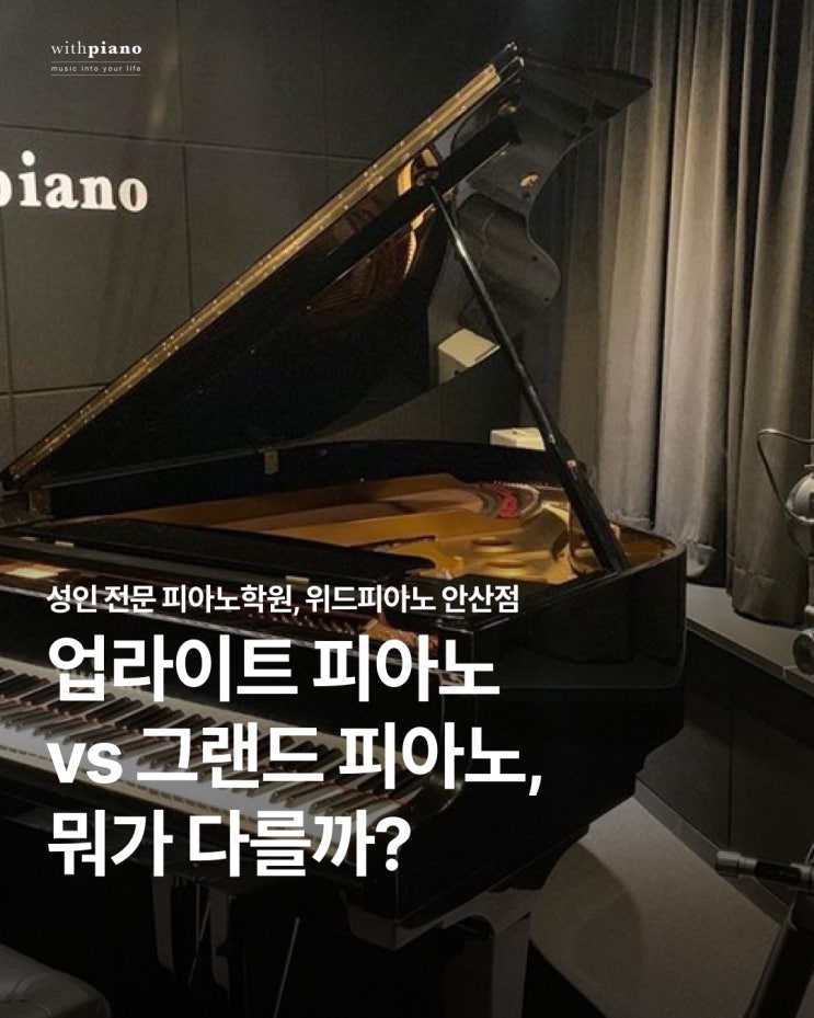안녕하세요. 성인전문 피아노 학원, 위드 피아노 안산점입니다 :) 업라이트 피아노와 그랜드 피아노.. 느낌이 다른 건 알겠는데 정확히 어떤 게 다른 거지? 궁금해하시는 분들이 있을 거 같아 오늘은 그 차이점을 알려드릴게요~! 1. 현(스트링) 길이 그랜드 피아노는 현이 가로로 길게 놓여 있어요. 그래서 소리가 더 깊고 풍부하게 울려요.업라이트 피아노는 공간을 아끼기 위해 현이 세로로 서 있고, 길이도 조금 짧아요. 2. 해머 움직임 그랜드 피아노는 해머가 아래에서 위로 튀어 오르고 중력 때문에 바로 떨어져요. 업라이트 피아노는 앞에서 뒤로 움직이고,스프링 힘으로 다시 돌아와요. 이 차이가 손에 느껴지는 반응을 만들어요! 3. 반....... <img src="https://blogthumb.pstatic.net/MjAyNjAxMTBfMTA2/MDAxNzY4MDMwNzA0NDU1.IiJNvydQssbYJ4uoP_p4GH32SMFdT5FiU51g-EmHwIIg.yfLlf9udb7EVV3pa7Vg2K8vpjgLj4ElX4H12CRHr0L0g.JPEG/Instagram_post_-_90.jpg?type=s3" />