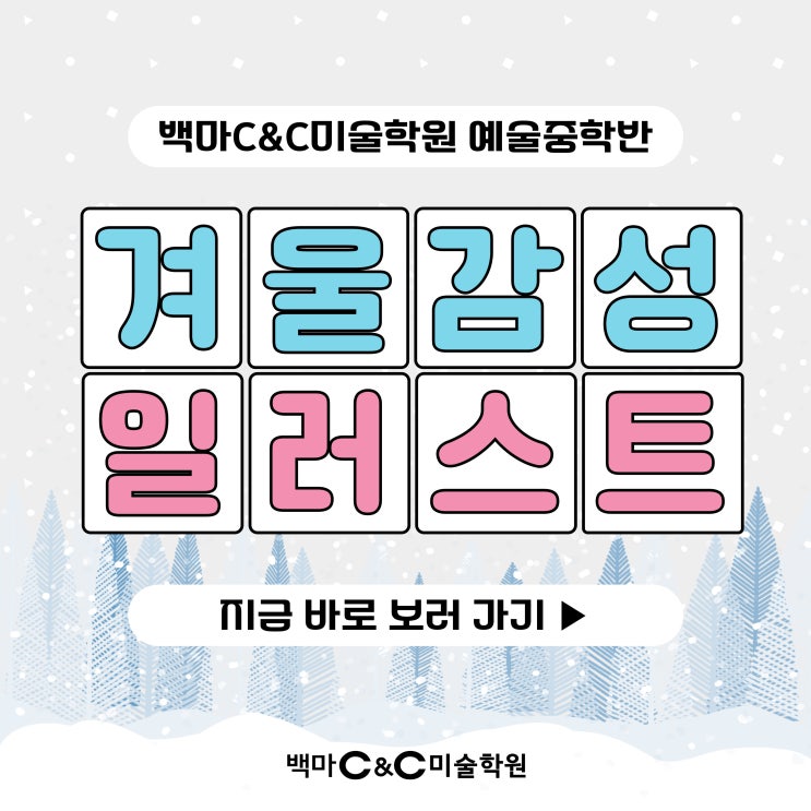 안녕하세요, 백마C&C미술학원 예술중학반입니다 다시 또 찾아온 한파에 몸이 움츠려드는 한주였는데요~ 그래서 준비한 이번 수업! 예술중학반 친구들과 함께 '따뜻한 겨울 일러스트 그리기 수업'을 진행해 보았어요~ 눈 내리는 거리, 반짝이는 조명 포근한 실내 공간, 연말연초의 분위기까지! 겨울 하면 떠오르는 장면들을 생각하며 아이들 각자의 상상력을 담은 그림을 만들어보는 수업 시간이었습니다~ 내 방 침대에 누워 이불을 덮고 방안에 가득 놓인 인형들과 빛이 나는 오르골을 만지고 있는 모습, 눈사람이 들어 있는 투명볼을 들고 있는 모습 등 친구들만의 개성이 담긴 그림들이 그려졌는데요~ 여기에 AI 이미지(생성형 이....... <img src="https://blogthumb.pstatic.net/MjAyNjAyMDdfMTMy/MDAxNzcwNDU2MzkzNTc1._N9YtFCPcWMwxPyvZn8F74kP39HaUikI5PrxUCBZWusg.rLqNnOYNopZzIpNxo2lxV6yjc9kg77LCYQt-NZSmZPYg.JPEG/%C1%A6%B8%F1%C0%BB-%C0%D4%B7%C2%C7%D8%C1%D6%BC%BC%BF%E4_-001_%282%29.jpg?type=s3" />