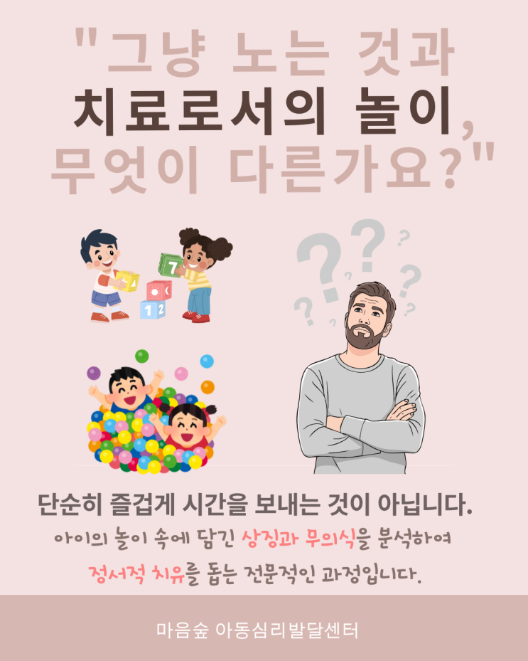 안녕하세요, 365다움의원파주운정 병원부설 마음숲 아동심리발달센터입니다. 아이는 어른처럼 자신의 마음을 말로 다 표현하기 어렵습니다. 어른들이 힘든 일을 대화로 풀 듯, 아이들은 '놀이'라는 그들만의 언어를 통해 속마음을 이야기하고 상처를 치유합니다. 365다움의원 파주운정 병원부설 마음숲 아동심리발달센터의 놀이치료는 단순히 즐겁게 시간을 보내는 것을 넘어, 아이의 놀이 속에 담긴 상징과 의미를 분석하고 정서적 성장을 돕는 전문적인 심리치료 과정입니다. 1. 놀이는 아이들의 '언어'입니다 (Symbolic Play) 어른에게는 언어가 있다면, 아이들에게는 놀이가 있습니다. 전문성: 아이는 현실에서 겪은 갈....... <img src="https://blogthumb.pstatic.net/MjAyNjAxMjhfMjI3/MDAxNzY5NTkyNDUwNTg1.AdkdjIfhlGPadO7uX_yQpi2mTgQVpHEPpFqM8mlYq40g.-p_rJw8iXugqrCos4sEaBbxYsxu_OwBaU2QXX88rlPog.PNG/2.png?type=s3" />