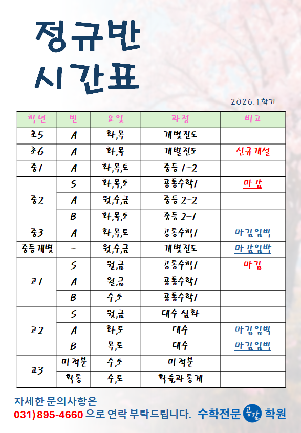 안녕하세요. 공감수학입니다. 겨울방학동안 공감수학의 모든 학생들이 다음학기를 열심히 준비하였습니다. 1학기에 겨울방학 고생의 성과가 있기를 바랍니다. 2026년 1학기의 시간표를 안내드립니다. 문의 및 상담을 위한 전화/방문은 언제든 환영합니다~ 감사합니다. <img src="https://blogthumb.pstatic.net/MjAyNjAyMjNfOTMg/MDAxNzcxODM3MzI3NDQx.XyVfi0-Zlp2KAXELVLq8yYdCzPtGYNQDg0h3uw5AuRkg.pJpSdVI9ItJQf1ZMlrDVFYngo4mTR0qlNWRewe7Jvw8g.PNG/1%C7%D0%B1%E2_%BD%C3%B0%A3%C7%A5.png?type=s3" />