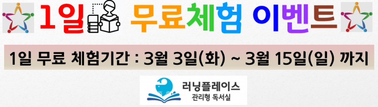 새학년, 새봄 공부의지를 실천할 수 있는 러플관독에서 무료료 1일 공부해보세요. 1일 무료체험기간: 3월 3일(화)~3월 15일(일)까지 관리형독서실에서 공부하면; 순공부시간은 자연스레 늘어나고 집중학습으로 학습효능감을 경험할 수 있어요. 공부는 하면된다는 자기효능감을 느끼면서 꾸준히 공부하면 목표를 이룰 수 있어요. 망설이지 말고 행동하세요! <img src="https://blogthumb.pstatic.net/MjAyNjAyMjNfMTI0/MDAxNzcxODMzNDQzNTI0.j_1kt9rEBijpF-zgNS7iHPcs18xJ0PsQbU7OTat78mwg.vamgxZXC1KTbyhfbTpsPEL2_Etv-5Lkt6Sx04Ka1D8cg.PNG/%BD%BA%C5%A9%B8%B0%BC%A6_2026-02-23_164903.png?type=s3" />