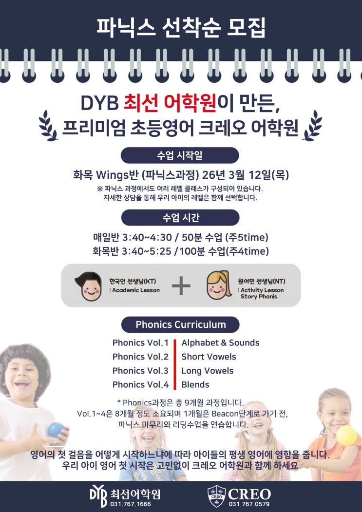 안녕하세요 Do Your Best!! 언제나 최선을 다하는 DYB 최선&크레오 어학원 경기광주캠퍼스입니다. 신규 파닉스 클래스가 3월 오픈합니다!! 구글폼 링크 신청방법 구글폼 링크 영어의 첫 걸음을 어떻게 시작하느냐에 따라 아이들의 평생 영어에 영향을 준다고 합니다 CREO어학원의 파닉스 수업은 DYB최선어학원으로 나아가기 위한 위대한 첫 걸음이 됩니다 혹시 CREO라서? DYB최선이라서? 어렵게 배우고 힘들지 않을까 걱정이라면? 자신있게 말씀 드립니다. 정말 즐겁게 수업하는 파니스레벨입니다!! 앞으로 10년 이상을 공부해야 할 영어! 1년, 2년.. 10년 후 남들과 다른 경쟁력과 결과를 원하신다면 우리 아이 영....... <img src="https://blogthumb.pstatic.net/MjAyNjAyMjJfMjgz/MDAxNzcxNzYxNzUxMDkw.G3vPqb0eWpzekUh-ZF0SnnJFVWH4pz9LH_f-caiWa3Ug._xtmLRsDUEkZ9F3fQNzf723WcRrJdPwgD64rG0I5gKsg.JPEG/2026_%C6%C4%B4%D0%BD%BA%B8%F0%C1%FD.jpg?type=s3" />