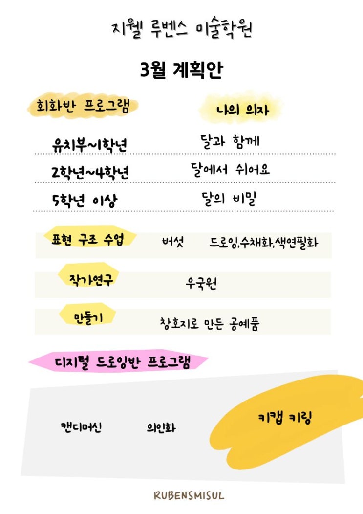안녕하세요. 지웰 루벤스 미술학원 학부모님. 26년 3월 계획안 안내와 2월 수업 내용에 대해 말씀 드리겠습니다. ^^ 회화 그리기, 디지털 드로잉반 <3월 계획안> 그리기 수업 주제는 자체 제작 프로그램으로하고 있습니다. 수업은 연령별 수준별에 맞게 진행합니다. 이외에 각 학생들에 맞는 기초적인 (소묘, 수채화 등) 수업들도 진행되며 고학년일수록 개별적인 미술 수업이 진행됩니다. 1월엔 어떤 수업을 했는지 살펴볼까요? <1월 그리기반 수업 풍경> 안정적인 수업을 위해 아래처럼 아이들이 더 생각해보고 스스로 그림을 그릴 수 있도록 돕는 루벤스 자체제작 워크지 활동을 진행하여 수업을 진행하였습니다. 학생이 주제에 대....... <img src="https://blogthumb.pstatic.net/MjAyNjAyMjNfMTEw/MDAxNzcxODIwOTgyMjIw.MJ6oeBatTquGMZNKy4vTxYwIen6pRldQonHAEUbtEZYg.cyFeLO9XcSHF3cPHFsbgJAUI9cuzJaB07SQ2aGDvKAsg.JPEG/%C1%A6%B8%F1%C0%BB_%C0%D4%B7%C2%C7%D8%C1%D6%BC%BC%BF%E4._%284%29.jpg?type=s3" />