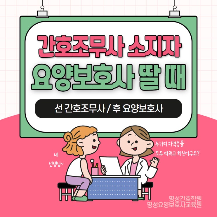 안녕하세요! 성북구 장위동 명성간호학원&요양보호사교육원입니다. "간호조무사 자격증이 있는데, 요양보호사도 따야 할까요?" 또는 "간호조무사랑 요양보호사를 동시에 취득할 수 있을까요?" 하고 현직에 계시거나 자격증을 갓 취득하신 분, 간호조무사 수강문의하러 오신 분들이 가장 많이 하시는 질문입니다. 결론부터 말씀드리면, 간호조무사 자격증 소지자가 요양보호사를 취득할 때 얻는 혜택이 더 큽니다. 구체적으로 어떤 부분인지 안내드리겠습니다! 간호조무사와 요양보호사, 왜 '쌍자격'이 대세일까? 먼저 간호조무사는 일반 병원, 의원, 한의원에서 뿐만 아니라 실버 산업 현장인 요양원, 주야간....... <img src="https://blogthumb.pstatic.net/MjAyNjAyMDVfMjEy/MDAxNzcwMjYwMDgzMDkz.1VDvCbcavbLesnovIrXmWUEaRuay5V44su_e0Tr3sJQg.8Y9xAhFuH21qUfZgbbaUeYPBQICOOVRJS0Tuux-OBQQg.JPEG/%C1%A6%B8%F1%C0%BB_%C0%D4%B7%C2%C7%CF%BC%BC%BF%E4_%2880%29.jpg?type=s3" />