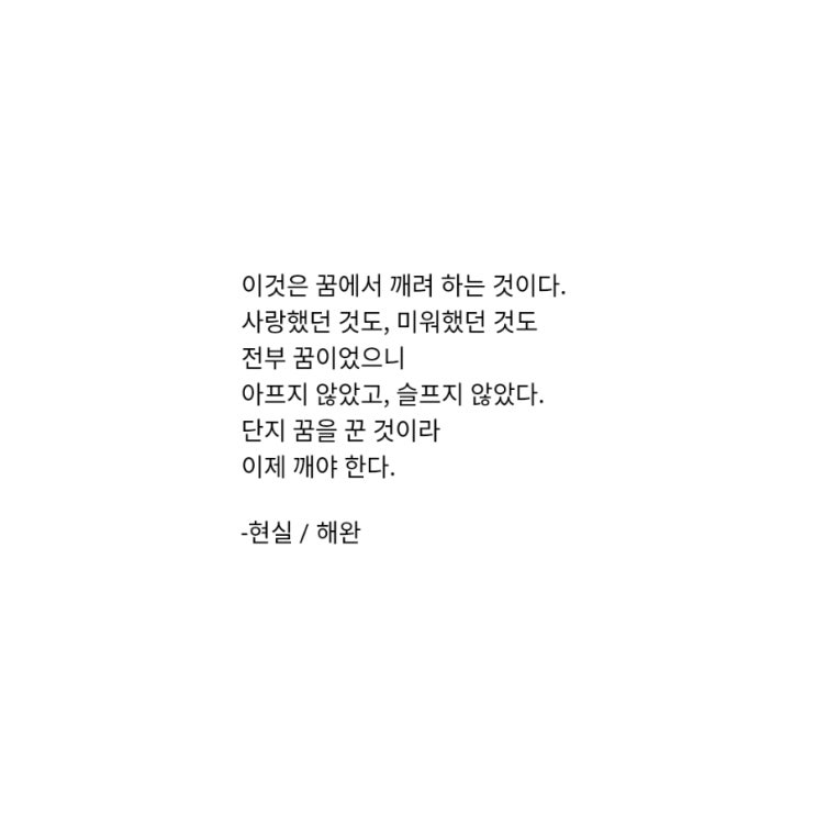 이것은 꿈에서 깨려 하는 것이다. 사랑했던 것도, 미워했던 것도 전부 꿈이었으니 아프지 않았고, 슬프지 않았다. 단지 꿈을 꾼 것이라 이제 깨야 한다. -현실 / 해완 <img src="https://blogthumb.pstatic.net/MjAyNjAzMjFfMjMg/MDAxNzc0MDIwNTA0NzUx.ud5web1C8fZItUVjwTiW_2lQCglZ1BNGZdd9kwg-AwIg.BDxB2m5bCV1dmVzMBiXh-_zPkQn56UVA9Uf8s7BW48Qg.JPEG/900%A3%DF20260321002737.jpg?type=s3" />