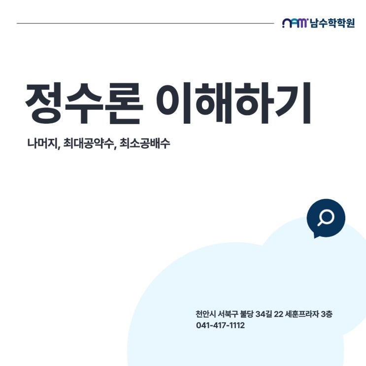 안녕하세요, 남수학학원입니다. 수학을 어려워하는 학생들이 자주 하는 얘기가 있습니다. '공식은 외웠는데 왜 그렇게 되는지는 모르겠어요.' 이 생각을 자주 단원이 바로 정수론, 그 중에서도 나머지, 최대공약수, 최소공배수입니다. 정수론은 그래프도 없고, 확률처럼 게임 같은 무제도 없습니다. 하지만 중등 수학의 기초이자, 고등 수학과 이후 수학 전반으로 이어지는 사고력의 출발이 되는 개념이라고 할 수 있죠. 정수론이란 무엇인가? 정수론은 말 그대로 정수(..., -2, -1, 0, 1, 2, ...)를 연구하는 수학의 한 분야입니다. 중학교 과정에서 배우는 정수론의 핵심은 → 나누어떨어짐과 나머지 → 최대공약수 → 최소공배수 이....... <img src="https://blogthumb.pstatic.net/MjAyNTEyMjdfMTMg/MDAxNzY2ODE3MzY1MDA3.hKZEu2ZUO7QOg3uZDnzZZaZ8ftBVNqwnCjgqmuXa278g.3iY9jZhN8RZfk8d4Hqm5GuggvUKr7rhZ2SfAS87nxdUg.JPEG/1_%2812%29.jpg?type=s3" />