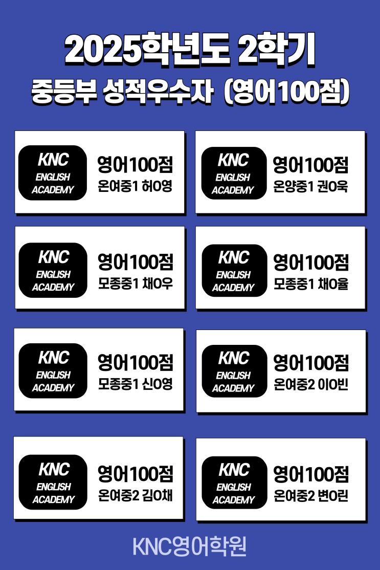 2025학년도 2학기 중등부 성적우수자(영어100점 44명배출)