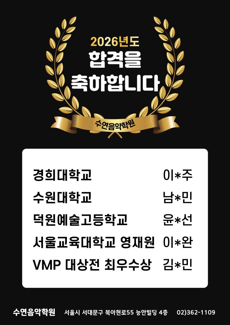 2026학년도 합격을 진심으로 축하합니다 수연음악학원과 함께 최선을 다해 준비해온 우리 학생들의 값진 결실을 전하게 되어 매우 기쁩니다. 긴 시간 동안 성실하게 노력하며 자신의 한계를 넘어선 학생들의 열정과 끈기에 큰 박수를 보냅니다. 또한 믿고 함께해주신 학부모님들께도 깊이 감사드립니다. 2026학년도 합격 및 수상자 경희대학교 수원대학교 덕원예술고등학교 서울교육대학교 영재원 VMP 대상전 최우수상 수상 합격이라는 결과 뒤에는 학생들의 노력과 지도 교수진의 체계적인 교육, 그리고 가족의 응원이 함께 있었습니다. 수연음악학원은 앞으로도 학생 한 명 한 명의 가능성을 발견하고 최고의 결과로 이....... <img src="https://blogthumb.pstatic.net/MjAyNjAyMjNfMTk2/MDAxNzcxNzcyNTk4NjE1.mhyMcH0s0Tjq8_EXtcA7gFpe6TpdLJNMJWceIm1qoqog.7Wozc46bIqQK2pU__8CWZsLNyg5X4GrRVIpK0nUlru8g.JPEG/2026-001.jpg?type=s3" />
