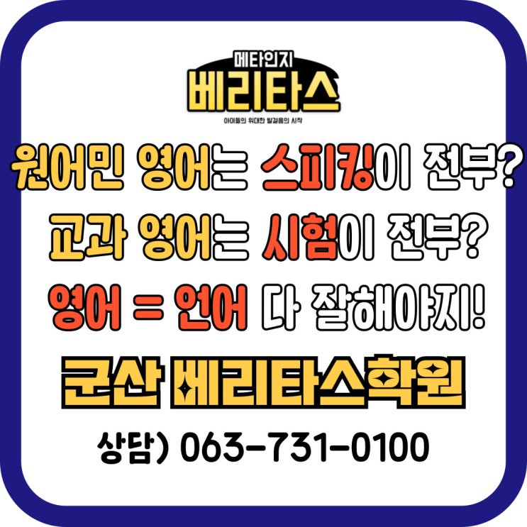 영어는 스피킹이 전부일까요? 영어는 언어입니다. 듣고 말하고 읽고 이해하고 문제를 해결하는 도구입니다. 하지만 한국의 원어민 수업은 '스피킹'이라는 인식에서 벗어나지 못하고 있습니다. 이에는 여러가지 이유가 있겠지만, 원어민 선생님의 주기적인 교체도 장기적이 노력과 학습이 필요한 문법, 라이팅, 시험대비, 디베이팅이 불가능한 이유이기도 합니다. 군산 조촌동 베리타스학원(이하 본원)은 원어민 선생님의 교체가 없고 서울대 사범대 출신 원장의 관리를 곁들여 캐나다 명문대 출신 원어민 원장님께서 아이들의 미래를 진심으로 생각하며 지도합니다. 또한 본원은 스피킹에 국한된 기존의 “원어민=스피킹만”이라....... <img src="https://blogthumb.pstatic.net/MjAyNjAxMDhfMTY3/MDAxNzY3ODMwNjUxMTY2.HFn2Q19ky1h8AQapSmNK4fQPT2EIB6RUCa2LhatEiw0g.e0p8WznBQ_UqT9ohPeUtwBSp3RbEdzVmElDMOqajRQIg.JPEG/ig3-001.jpg?type=s3" />