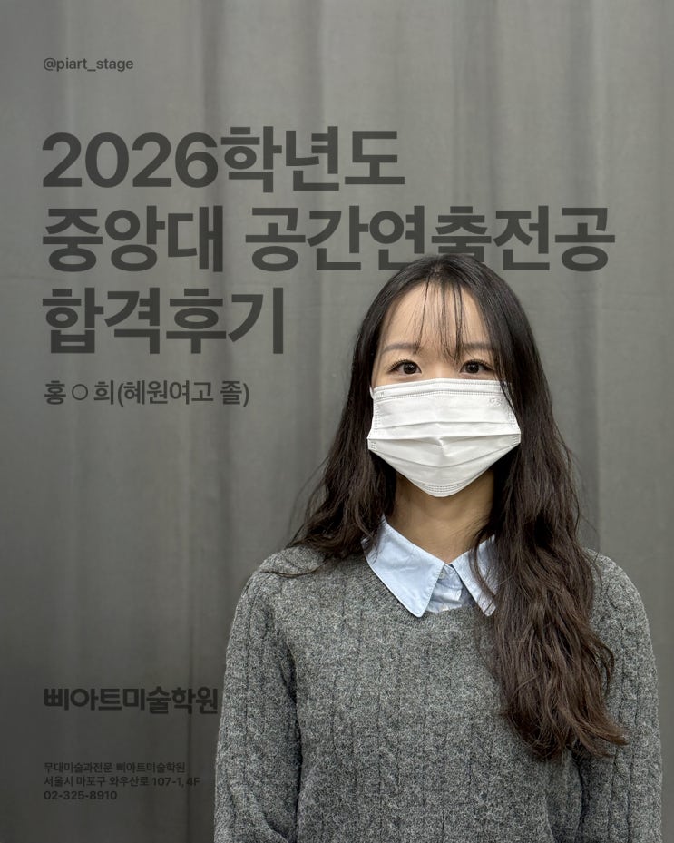 합격할 수 있었던 비결은? 수능공부와 실기를 균형있게 병행한 것이 가장 큰 합격 요인이라고 생각해요. 수업시간외 틈나는대로 드로잉을 하며 기본기를 다졌고 특히 정시특강 기간동안 선생님들의 정확한 피드백을 통해 실기력이 한단계 더 성장했다고 느꼈어요. 슬럼프는 어떻게 극복했나요? 슬럼프가 올 때는 무작정 버티기보단 잠시 쉬며 마음을 환기하려고 했어요. 영화나 애니메이션을 보며 감정을 정리하면 다시 제 그림을 바라볼 여유와 그림에 대한 열정을 자연스럽게 회복할 수 있었어요. 삐아트미술학원을 선택한 이유는? 삐아트는 무대과 입시학원 중에서 가장 오래되었고 한예종 중대 서경대 등 무대과가 있는 학교입시만 전문으로....... <img src="https://blogthumb.pstatic.net/MjAyNjAyMTNfMjc5/MDAxNzcwOTc0NjI1OTc4.flKXaG0YJ3nKOK3njLl7cpE71s7trQDL83Z4E94GxHUg.uNtRqv1XqjMGuZpNg-_pSNkM65JrCzszHG6Jl-68bakg.JPEG/KakaoTalk_20260212_223303726.jpg?type=s3" />