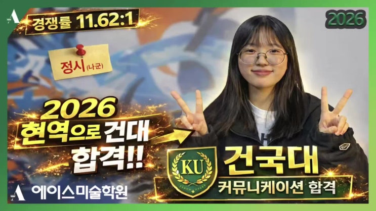 안녕하세요! 목포 남악 디자인스타미술학원입니다. 오늘 가져온 그림은 '2026학년도 건국대학교'에 실기 100% 전형으로 합격한 학생의 평소작입니다. 올해 건국대학교 수시는 26.91:1의 경쟁률로 그 어느 때보다 치열했습니다. 실기 100% 전형이다 보니 수시에서 내신성적에 관리에 부담을 느낀 학생들 중 실기 경력이 오래된 재수/N 수 생들까지 모두 몰려들며 엄청난 경쟁률이 발생했습니다. 목포 남악 디자인스타에서는 당당하게 압도적인 실기력으로 합격하게 되었습니다. 매년 꾸준하게 동일한 대학에서 좋은 입시 결과가 나오는 것이 진정한 학원의 실력이 아닐까요? 합격하고 싶다면 목포 남악에서는 역시! 디자인스타! 2026학....... <img src="https://blogthumb.pstatic.net/MjAyNjAzMTdfMTA3/MDAxNzczNzIzOTA2NzE1.FWbEG3HAWEpwimf_pwAn8RXfpEVJ-Kl6B2EgGd5jatwg.R07BK2NvxfX5lNiDLEnP-MEZDx4Sj_nWaCJsoSlLFAMg.JPEG/4.%B9%DA%C0%AF%BC%B1_%B0%C7%B1%B9%B4%EB.jpg?type=s3" />