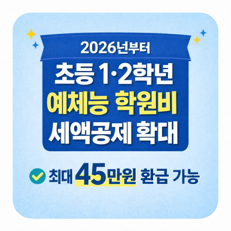 안녕하세요. 2026년부터 반가운 변화가 생깁니다. 초등학교 1~2학년(만 9세 미만) 자녀의 예체능 학원비도 교육비 세액공제 대상에 포함됩니다. 기존에는 예체능 학원비 세액공제가 ✔ 미취학 아동에게만 적용됐습니다. 하지만 2026년부터는 ✔ 미취학 아동 + 초등학교 1·2학년(만 9세 미만)까지 확대됩니다. 2️⃣ 어떤 학원비가 공제되는지 살펴볼게요. 공제 대상은 ‘예체능 분야’에 해당하는 학원비입니다. ✔ 음악: 바이올린, 피아노,성악 등 ✔ 체육: 축구, 검도, 태권도, 유도, 수영, 체조 등 ✔ 미술: 드로잉, 공예 ✔ 공연예술: 발레, 무용, 3️⃣ 얼마나 돌려받을 수 있을까요? ✔ 공제율: 지출액의 15% ✔ 연간 한도: 자녀 1인당 300....... <img src="https://blogthumb.pstatic.net/MjAyNjAyMTJfODEg/MDAxNzcwODYxMjY5NTUz.bHZHQ72dCoH0DytyBwxaWulB55yB5WIOdCkNlDdSY0Mg.nOuXbDaM0hi3nvtWdFuNDMTQuqVqFs5WKgLXLJAhxIsg.PNG/file%A3%DF00000000c2b0720b872890a337be261c.png?type=s3" />