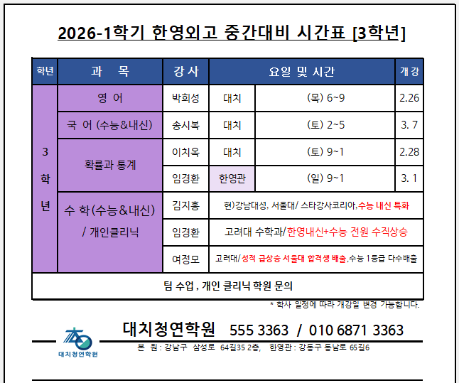 ● 전공어 시간표는 학원으로 문의 주세요 !!! (학교 공지 확인후 블로그에 올립니다.~) #한영외고 #한영 스페인어 #한영외고 독일어 #한영외고 프랑스어 #한영외고 #한영 #대치동 한영내신 #한영외고 내신 #한영외고 중국어 #한영내신전문학원 #한영외고합격자 #한영외고반 #한영영어 #박희성 #한영국어 #이유민 #송시복 #수능국어 #한영수학 #여준영 #임경환 #여정모 #김지홍 #장지식 #한영통사 #진민 #유연 #한국사 #한영통과 #한영통합사회 #오경미 #한영통합과학 #한영전공어 #한영불어 #장윤주 #엘리즈 #차민아 #한영스페인어 #아나벨 #장미라 #한영중국어 #한영독어 #최고운 #한영내신 #대치청연학원 #한영외고수학 #한영외고영어 #한영외....... <img src="https://blogthumb.pstatic.net/MjAyNjAyMjBfMTQy/MDAxNzcxNTg5MTgxMjk2.j76sl4zVq7Zewd3KKT6gYbnShcb5e0wYHWWxsawqwDUg.7viR4DVRyLu5CbviNXCEw8D6BSdsk95-9U_Q6e7ZzbYg.PNG/26-3-1_%C1%DF%B0%A3_%C7%D1%BF%B5_%B8%DE%C0%CE.png?type=s3" />