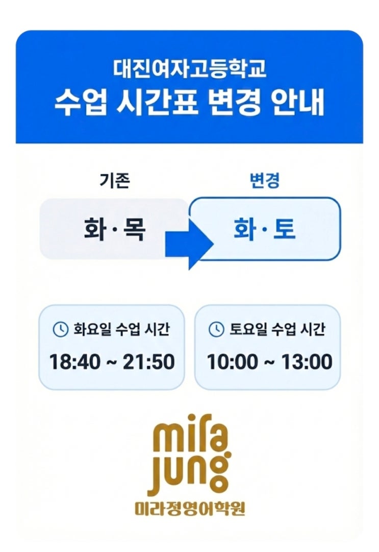안녕하세요 미라정영어학원입니다. 대진여고1 수업시간표가 기존 화목에서 화토로 변경되어서 공지합니다. 변경 전: 매주 화요일 / 목요일 변경 후: 매주 화요일 (6시40분-9시50분) / 토요일 (10시-1시) 우리의 목표는 '대진여고 내신영어1등급' 미라정 재원생 전원이 목표하는 성적을 거둘 수 있도록, 더욱 치밀하고 열정적인 강의로 보답하겠습니다. 준비된 자에게 1등급이 옵니다. 이번 학기도 미라정과 함께 힘차게 달려봅시다! #미라정영어학원 #대진여자고등학교 #대진여고영어학원 레테는 토/일 아래 시간에만 가능합니다 ▶️레테비는 무료입니다. 토요일 10시, 2시, 5시 일요일 2시, 5시 상담은 월.화.목.금 2시부....... <img src="https://blogthumb.pstatic.net/MjAyNjAyMjNfMjkg/MDAxNzcxODQyNzgwMTY0.uIlpfrOELNscOT9wt4ZADDk66NYdhTbKqeqly6K9W64g.6wUvqYBWpLQbCN3GS0EFWkg4RD1vlilgKkI0gJfMSZwg.JPEG/900%A3%DFScreenshot%A3%DF20260223%A3%DF121326%A3%DFGoogle.jpg?type=s3" />