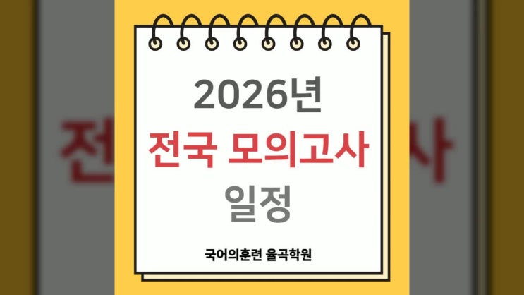 율곡동 국어학원 국어의훈련 율곡학원에서 전국의 고등학생을 대상으로 시행되는 2026년 전국 모의고사 일정을 안내해 드리도록 할게요. 2026년 전국 모의고사 일정 고1, 2학년 모의고사 일정 ▪ 3월 24일 (화) - 서울 교육청 주관 ▪ 6월 4일 (목) - 부산 교육청 주관 ▪ 9월 2일 (수) - 인천 교육청 주관 ▪ 10월 20일 (화) - 경기도 교육청 주관 고3 모의고사 일정 ▪ 3월 24일 (화) - 서울 교육청 주관 ▪ 5월 7일 (목) - 경기도 교육청 주관 ▪ 6월 4일 (목) - 한국교육과정평가원 주관 [수능 모의평가] ▪ 7월 8일 (수) - 인천 교육청 ▪ 9월 2일 (수) - 한국교육과정평가원 주관 [수능 모의평가] ▪ 10월 20일 (화) - 서울 교육청 주관 20....... <img src="https://phinf.pstatic.net/image.nmv/blog_2026_02_23_234/VAhEOcgJYP_01.jpg?type=f480x480" />
