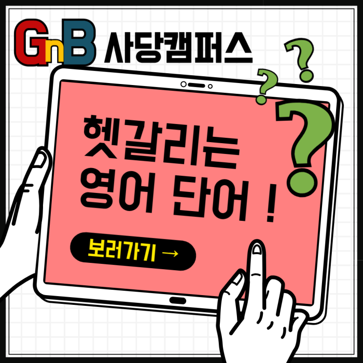안녕하세요 GnB사당캠퍼스 입니다! 오늘의 헷갈리는 영어 단어 알아보기!! 가볼까요 오늘의 주제는 ! between VS among 입니다 굉장히 닮은 단어지요? 뜻을 알고있는 친구들도 있을텐데요, 같이 정확히 알아보아요 1. between 2. (둘 중에서) 선택할 때 사용1. ~사이에 (둘 사이에) 이라는 뜻을 가진 단어네요! between은 주로 두 개의 대상 사이를 나타낼 때 씁니다. 예시를 볼까요? ex) This is a secret between you and me. → 이건 너와 나 사이의 비밀이야. (2명) 2. among 1. ~사이에 (세 개 이상의 대상이 있을 때) 라는 뜻을 가진 단어입니다! 예시를 볼까요? ex) She was sitting among her friends. → 친구들 무리 속에 앉아 있....... <img src="https://blogthumb.pstatic.net/MjAyNTA4MDhfMTg4/MDAxNzU0NjQzOTE4NDkz.O63TqSa3dwYu0z96iwNLmFkSXomQqaG7nmbLsa_Up1kg.mUzAnoy-ffMJwLTQhjrIP-kHLPFE2PCsWe8mSVmtOXsg.PNG/%C7%F2%B0%A5%B8%AE%B4%C2_%BF%B5%BE%EE%B4%DC%BE%EE-001.png?type=s3" />