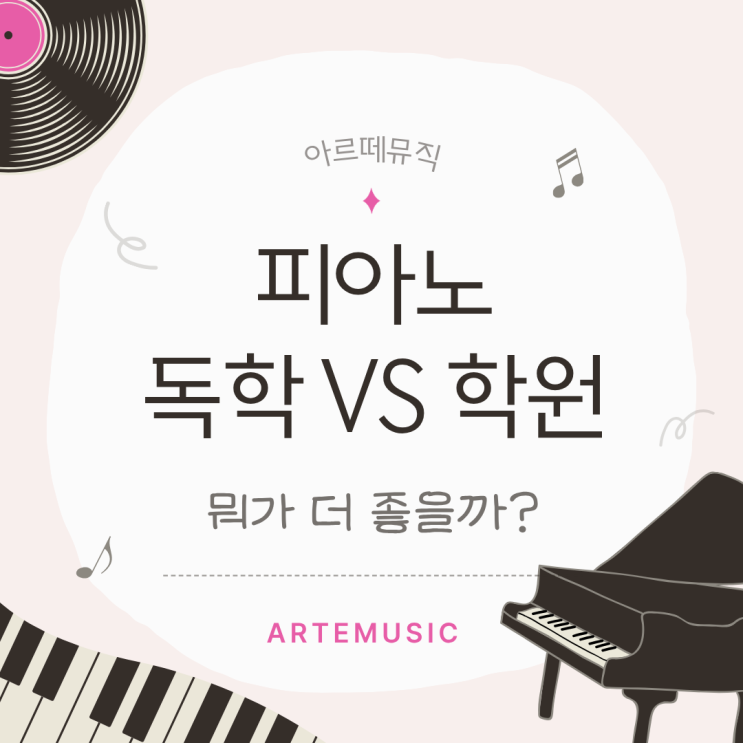 피아노 독학 vs 학원 뭐가 더 좋을까? 성인 취미 기준 정리 (아르떼뮤직) 피아노를 배우고 싶다면 누구나 한 번쯤 고민하게 됩니다. 바로 독학으로 시작할지 학원을 다닐지에 대한 선택인데요. 유튜브와 다양한 온라인 강의 덕분에 요즘은 독학으로도 충분히 시작할 수 있는 환경이 되었지만 여전히 많은 분들이 학원을 찾는 이유도 분명히 존재합니다. 오늘은 피아노 독학과 학원의 차이, 그리고 어떤 선택이 나에게 더 맞는지 정리해 드릴게요~! 피아노 독학의 장점과 단점 ✔️장점 비용 부담이 적다 시간과 장소 제약이 없다 내가 원하는 곡 위주로 자유롭게 연습 가능 특히 취미로 가볍게 시작하고 싶은 분들에게는 독학이 접근하기 쉬운 방....... <img src="https://blogthumb.pstatic.net/MjAyNjA0MDJfMjEg/MDAxNzc1MTE4NjQ5NDg4.KKcQZCR2vMAUNuyaMICXoOpmdobMyMgg1ebjMCdOfz8g.L5Rcy9nHEPdAKR9tZXcRqJS2r3_VitOts97CNlYte3Yg.PNG/%C1%A6%B8%F1%C0%BB_%C0%D4%B7%C2%C7%D8%C1%D6%BC%BC%BF%E4..png?type=s3" />