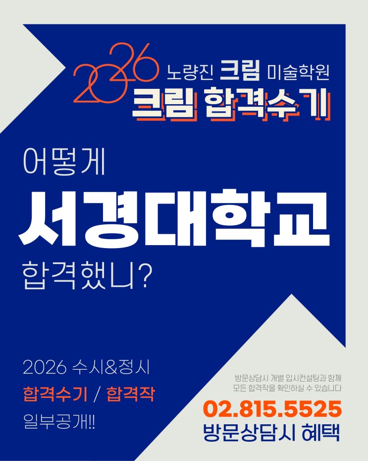 2026노량진 크림 미술학원 합격수기 2026 서경대학교 비주얼디자인과 합격생 평소작 공개!! 안녕하세요!! 노량진 크림 미술학원입니다. 크림 2026 합격생들 재현작 또는 평소작을 공개합니다. 그 중 서경대학교에 합격한 합격수기를 준비했습니다! 노량진 크림합격생의 합격 소감과 평소작까지 보여드릴 테니 자세히 봐 주세요!! 나는 이렇게 서경대학교 비주얼디자인과에 합격했다! 서경대학교 비주얼디자인과 합격! 지원동기 & 준비과정 서경대 비주얼디자인과 실기우수자전형에 지원했습니다. 주제어가 잘 보이게 스케치 하는것을 많이 연습하면서 준비했습니다. 문제풀이 바이스클램프와 랜선이 나왔습니다. 제시물 2인 랜선은 평태를 일....... <img src="https://blogthumb.pstatic.net/MjAyNjA0MDRfMjY3/MDAxNzc1MjcyNTI4NDQy.3Gvw3cGorTuMGexwe9sgHtMmZqwEdAuuBtwRK7dzMfMg.k5fgrNG94rpDEBBC8WI-eyQU0sUuKuK1Ba9yK3yl5Kgg.JPEG/2026_%C7%D5%B0%DD%BC%F6%B1%E2%BD%E6%B3%D7%C0%CF-07.jpg?type=s3" />