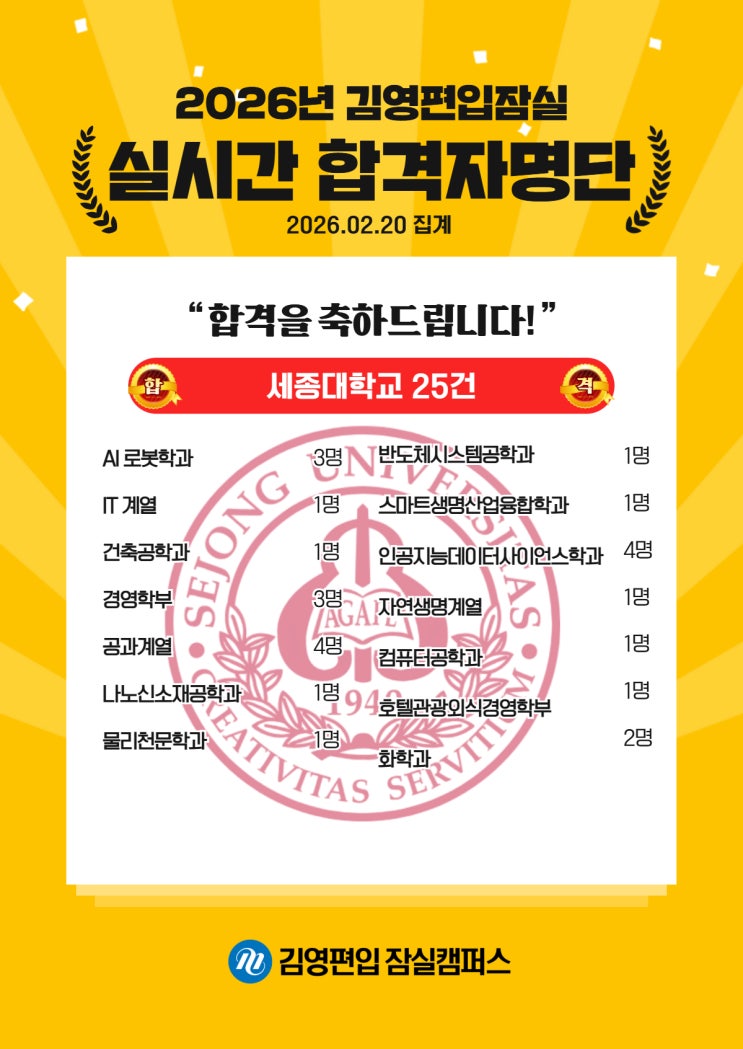 안녕하세요 잠실 강동 별내 위례 광진 천호 강남 송파 중랑 서초 구리 남양주 하남 김영편입 잠실캠퍼스 입니다. 2026학년도 편입학 전형에서 김영편입 잠실캠퍼스 수강생들이 세종대학교 '실시간 합격'으로 총 25건 합격하는 성과를 거두었습니다. 합격생 여러분 모두 축하드립니다 세종대학교 실시간 합격자(C:김영편입잠실) 세종대학교 실시간 합격 현황 (총 25건) 인문·사회계열 경영학부: 3명 호텔관광외식경영학부: 2명 자연·공학계열 AI로봇학과: 3명 IT계열: 1명 건축공학과: 1명 공과계열: 4명 나노신소재공학과: 1명 물리천문학과: 1명 반도체시스템공학과: 1명 스마트생명산업융합학과: 1명 인공지능데이터사이언....... <img src="https://blogthumb.pstatic.net/MjAyNjAyMjBfMTE2/MDAxNzcxNTY2Njg2MTYy.8ClR0-y6VvcK1OW-shAR7V5CBfKkWhlLzgx-KS_ZbuYg.UL8SQCdj8-_hD3PDdAXuro4UMBuC3SsSBbWuQD85Zu8g.JPEG/%BC%BC%C1%BE%B4%EB.jpg?type=s3" />