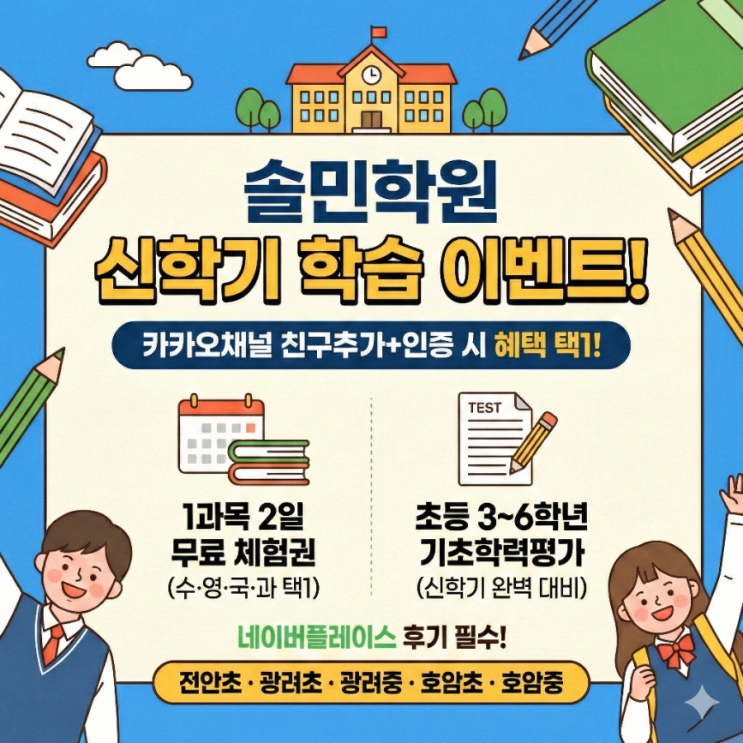 신학기 전, 꼭 필요한 학습 점검!! 솔민학원 1·2호점 학습 체험 이벤트 안내드립니다! 신학기를 앞두고 많은 학부모님들께서 공통적으로 고민하시는 부분이 있습니다. “우리 아이, 지금 실력으로 새 학년을 잘 시작할 수 있을까?” “이 학원의 수업 방식이 우리 아이에게 맞을까?” 솔민학원은 이 고민을 체험과 점검으로 직접 확인하실 수 있도록 신학기 대비 학습 체험 이벤트를 준비했습니다 이벤트 참여 방법 1️⃣ 솔민학원 1호점·2호점 카카오 채널 친구 추가 2️⃣ 친구 추가 화면 인증 3️⃣ 아래 혜택 중 1가지 선택 4️⃣ 체험 후 네이버 플레이스 후기 작성(필수) 100% 제공 혜택 (선착순+조건 충족 시) ✔ 선택 ① 과목....... <img src="https://blogthumb.pstatic.net/MjAyNjAyMDhfMzMg/MDAxNzcwNTU3MDE0NTU5._UINwj-neVnHnMgbo4f8X3ODWknbugeAzYA-05hLBlkg.5Zw0HGzvhyqS-T9Rq7CUQ0PCj_2WKoxM-IVzCv8WKHMg.PNG/900%A3%DF1770556966293.png?type=s3" />