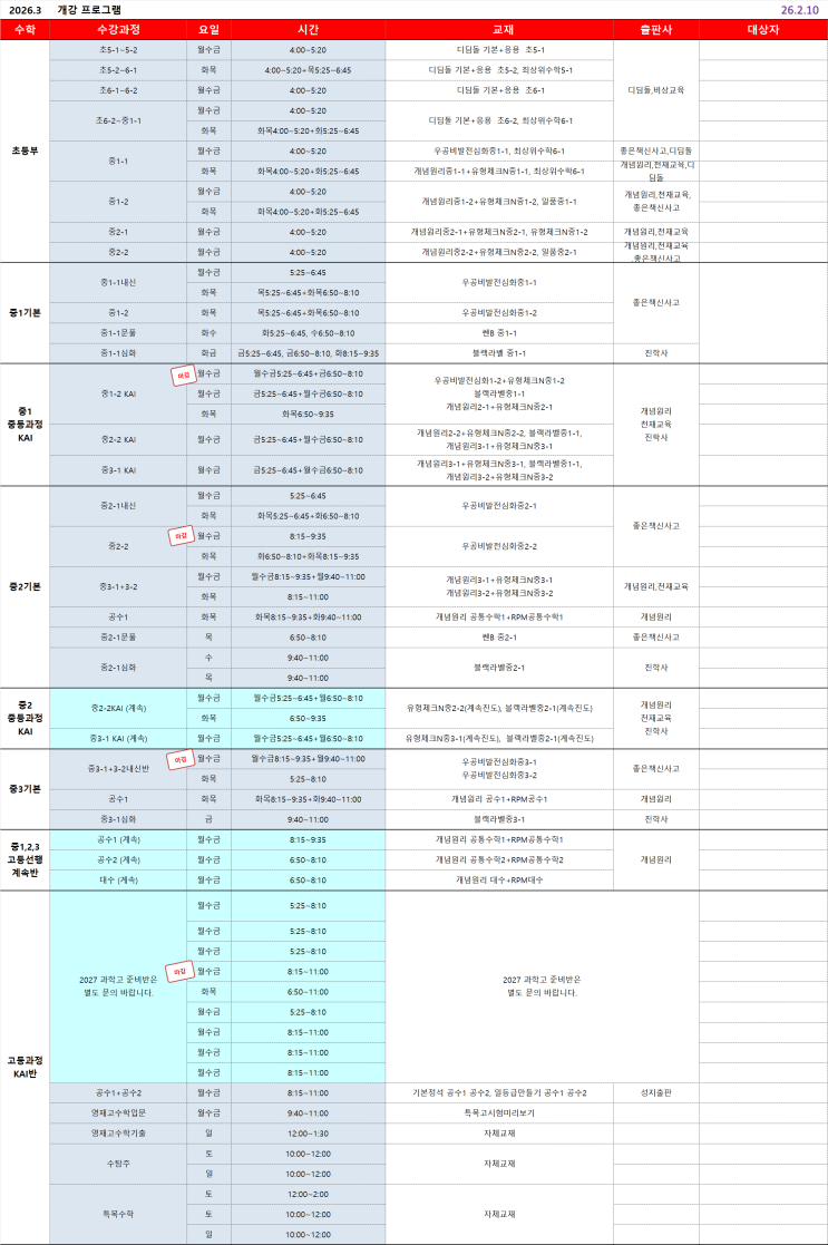 [공지] 2026년 알고학원 3월 봄학기 정규반 시간표 및 개강 안내 - 수학, 과학, 영어, AI코딩