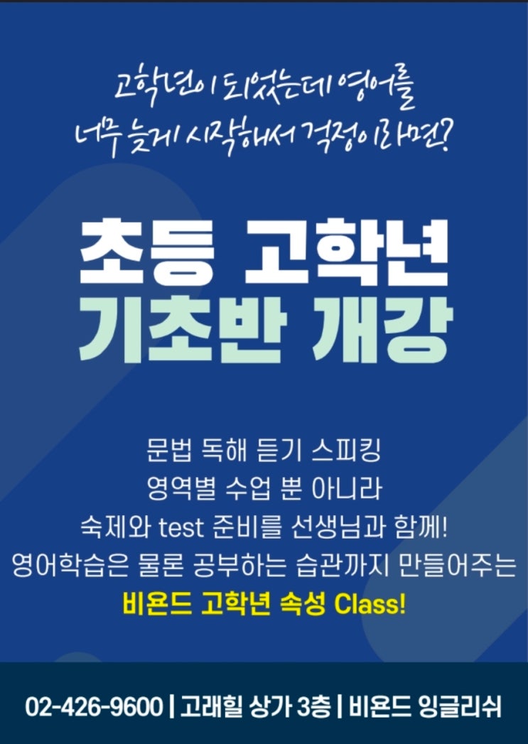 안녕하세요. 비욘드잉글리쉬 고덕캠퍼스 린지샘입니다. 묘곡초 .명덕초 친구들을 위한 고학년 영어 신규반 개강 안내드립니다. 3/11 수요일 3시 개강(월수금) 3/12 목요일 3시 개강(화목) – 예비중등을 위한 전략적 영어 도약 과정 (월수금 / 화목) 초등 고학년은 영어 학습의 방향이 완전히 달라지는 시기입니다. 단순히 “읽을 수 있는 영어”에서 벗어나, 이해하고 분석하며, 논리적으로 표현하는 영어로 전환되어야 합니다. 특히 예비중등으로 입문하는 시점은 향후 3년의 내신 성적을 좌우하는 매우 중요한 골든타임입니다. 이 시기에 독해력·문장 구조 이해·쓰기 능력을 체계적으로 정리하지 않으면 중학교 영어 내신에서 문법과 서술형 문....... <img src="https://blogthumb.pstatic.net/MjAyNjAyMjBfMjky/MDAxNzcxNTI2NTM4Mjg3.vN4glyV1qQ2YghyGVBWErxLJ5_RCLjWx8DcSjQvT-igg.Ll3l8xmubxzb4a1t2ukj5lH6s1HEru42aNf0nk3cPVEg.JPEG/900%A3%DFScreenshot%A3%DF20260220%A3%DF030006%A3%DFKakaoTalk.jpg?type=s3" />