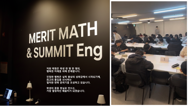 안녕하세요. 강동속의 대치, 메리트수학 & 써밋영어입니다. 많은 학부모님들의 응원과 신뢰 덕분에 저희 메리트교육이 확장 이전을 성공적으로 마무리하고, 더 넓고 쾌적한 공간에서 새롭게 출발하게 되었습니다. 오늘은 학부모님들께 새로운 학원 전경과 달라진 시스템을 소개드리며 집들이 겸 인사를 드리려고 합니다. “ 이번 이전의 핵심은 ‘피드백실’입니다 ” 이번 확장 이전에서 저희가 가장 심혈을 기울인 공간은 바로 ‘피드백실’ 입니다. 기존에 분산되어 있던 피드백 공간을 70석 규모의 대형 통합 피드백실로 구성하여, ✔ 학생들은 더 넓고 쾌적한 환경에서 ✔ 조교진과 담임 선생님들은 한눈에 학생들을 관리할 수 있도록 학....... <img src="https://blogthumb.pstatic.net/MjAyNjAyMjBfOTcg/MDAxNzcxNTczMzEyMDIy.xGN9aSvB_QOb1CX1OB_Ce_WHWetNLJxMofb8a3nqdWcg.SpEtTJMR1vSwrLrPCp4-LsVauLcMd9Z1AYIUG6hxS80g.PNG/%B8%DE%B8%AE%C6%AE%BD%C5%B0%FC.png?type=s3" />