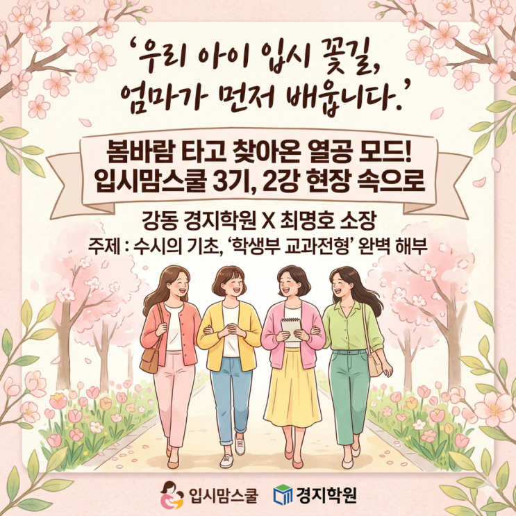 안녕하세요! 강동구 입시의 중심, 입시맘스쿨입니다. 어느덧 만개한 꽃들과 함께 우리 입시맘들의 공부 열기도 뜨거워지고 있습니다. 지난 3월 26일(목), 올댓스터디 대강의실에서 진행된 입시맘스쿨 3기 배움터 2강은 그야말로 열정의 도가니였습니다. 이번 시간은 수시의 핵심이자 기초인 '학생부 교과전형'을 완벽하게 해부하는 시간이었습니다. 열띤 강의 현장을 생생하게 요약해 드립니다! [1교시] 중·고교 내신 평가와 수행평가의 진실 1교시는 입시맘스쿨이 배출한 최고의 선배이자, 학부모의 마음을 누구보다 잘 아는 정미란 1기 회장님이 문을 열어주셨습니다. 중학교 A와 고등학교 1등급은 다르다? 중학교 절대평가에서 A를....... <img src="https://blogthumb.pstatic.net/MjAyNjAzMjdfMjIx/MDAxNzc0NTQyNjcwNDIw.xc1lj2mwATeMFQiXJx3-rawvLViIQ9eetSuYLqy0ohEg.6khs2WeF8-yfrjkYFpUmLb37D1r-VL8ve9hXgH0RarEg.PNG/1.png?type=s3" />