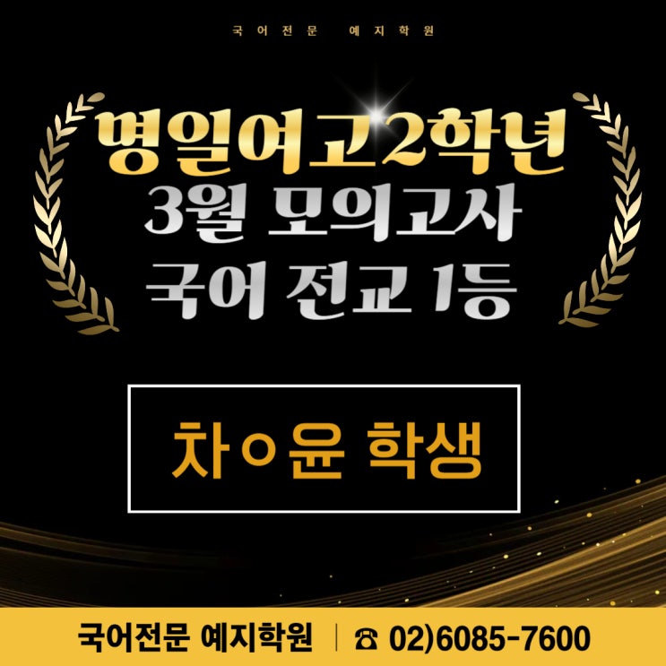 안녕하세요 국어전문 예지학원입니다. 3월 모의고사에서 반가운 소식을 전합니다 명일여고 2학년 차ㅇ윤 학생이 국어 전교 1등의 우수한 성과를 거두었습니다. 예지학원은 학생 개개인의 학습 상태를 세밀하게 파악하여 효율적인 학습 방향을 제시하고, 실질적인 성적 향상으로 이어질 수 있도록 지도하고 있습니다. 앞으로도 학생들이 자신의 목표를 이룰 수 있도록 최선을 다해 지도하겠습니다. 다시 한 번, 전교 1등을 달성한 차ㅇ윤 학생에게 진심으로 축하의 박수를 보냅니다 예지학원은 항상 최선을 다하겠습니다. 교육상담 : 02-6085-7800 <img src="https://blogthumb.pstatic.net/MjAyNjAzMjlfMjIz/MDAxNzc0NzU2MDMwMDAw.06aDojyjOPhtWgWOEYAExNzjCsp5V1QrCiAYj5C32A8g.X-ke5WufNHUKQbVFXC88KJkdt6gC5VNXQtGLCen6Zwkg.JPEG/%B8%ED%C0%CF%BF%A9%B0%ED2%C7%D0%B3%E23%BF%F9%B8%F0%C0%C7%B0%ED%BB%E71%B5%EE.jpg?type=s3" />