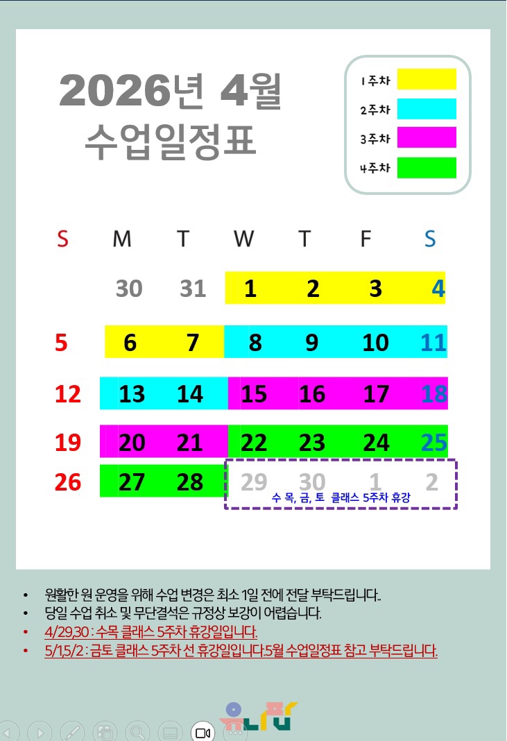 안녕하세요? 강일동 미술학원 유니팝미술입니다. 2026년 4월 · 5월 수업일정표 안내드립니다. (첨부 이미지 참고 부탁드립니다) [4월 안내] 4/29(수), 4/30(목) → 수·목 클래스 5주차 휴강 [5월 안내] ✔ 5/1(금), 5/2(토) 금토클래스 5주차 미리 휴강 * 해당 주에 5월 가정의 달(어린이날 등) 일정이 많으셔서 미리 5주차 휴강 진행합니다.^^ ✔ 5/5(화) → 화요 클래스 어린이날 휴강 * 화요클래스 5/5 휴강은 6/30(화) 보강 예정입니다. ✔ 월요 클래스 5/4 월요일 5/25 대체휴일 정상수업 진행 * 참석이 어려우신 경우 별도 보강으로 연락드리겠습니다. [수업 관련 안내] 수업 변경은 최소 1일 전 전달 부탁드립니다. 당....... <img src="https://blogthumb.pstatic.net/MjAyNjA0MDJfMTYx/MDAxNzc1MDg1MTk0OTky._LRNjof5-w9vCK5Tsx1isW0yodus2edxH2SLe5228Dwg.GD_OwQDBJ0ZLHuXT9gm3-GPIQm0lfKF4uu4spbhMFSAg.JPEG/https%A3%DF%A3%DF%A3%DFup%A3%ADkids%A3%ADkage.kakao.com%A3%DFdn%A3%DFlUnC3%A3%DFdJMcajayKll%A3%DFKxsJ4TE5BC8vHEEg2Icryk%A3%DFi.jpg?type=s3" />