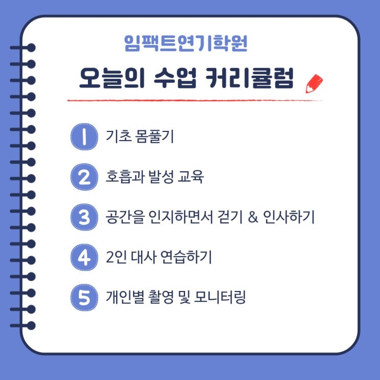 안녕하세요. 서울 연기학원 임팩트연기학원입니다. 오늘은 지난달 새로 개강한 카메라 연기 고등반 수업 과정을 소개해보려고 합니다. 학기초라 그런지 연기에 관심을 갖기 시작한 학생들이 많아졌습니다. 최근 들어 문의 전화도 꾸준히 이어지고 있는데요. 상담을 진행하다 보면 가장 많이 듣는 질문 중 하나가 바로 이것입니다. 연기학원에서는 실제로 뭘 배우나요? 그래서 오늘은 임팩트연기학원 고등부 수업에서 실제로 어떤 과정을 거치는지 간단하게 정리해보려고 합니다. 고1 카메라연기 기초반 : 연기의 기본을 만드는 시간 임팩트연기학원의 연기기초반은 특정 장르에 치중하기보다 무대 연기, 카메라 연기 이전에 신체•호흡•관찰•말....... <img src="https://blogthumb.pstatic.net/MjAyNjAyMDlfMTQ1/MDAxNzcwNjA0Nzc3NTIw.tBlP2APopbzLH-ttPM2of_n6k2LYTGEPvDBkamRDM0wg.W6ims0HoMFURRO9gUNEExaOeBJh7QWQrisvoOFDhrQwg.JPEG/%C1%A6%B8%F1%C0%BB_%C0%D4%B7%C2%C7%D8%C1%D6%BC%BC%BF%E4..jpg?type=s3" />