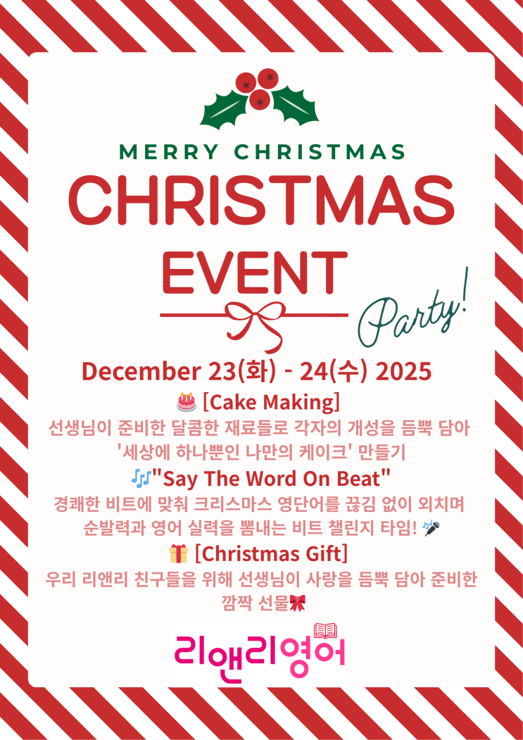 안녕하세요! 리앤리영어입니다. 어느덧 찬바람이 불어오는 12월, 거리마다 울려 퍼지는 캐롤에 마음이 설레는 연말입니다. 올 한 해 동안 저희 리앤리에서 누구보다 열정적으로 공부하며 훌쩍 성장한 우리 소중한 **'리둥이들'**을 위해 선생님이 아주 특별한 크리스마스 이벤트를 정성껏 준비했습니다! ✨ [파티 일정 및 안내] 날짜: 2025년 12월 23일(화), 24일(수) 정규 수업 시간에 진행됩니다! 수업 시간에 맞춰 등원하면 리둥이들을 위한 파티가 시작됩니다. ✨ 리앤리 크리스마스 파티 [Cake Making] 나만의 크리스마스 케이크 선생님이 준비한 달콤한 재료들로 각자의 개성이 듬뿍 담긴 **'세상에 하나뿐....... <img src="https://blogthumb.pstatic.net/MjAyNTEyMjNfNDYg/MDAxNzY2NDYzODc5ODY4.gW8znfNF1Dj4KmlsWSAbh8ytZ0Nc2sEOo5P2YJPk9eQg.69RPcPXpjpG00rZq1_EOCxjwVkUrs57aECpzEnXX1z0g.PNG/%C5%A9%B8%AE%BD%BA%B8%B6%BD%BA_%C6%C4%C6%BC_%C6%F7%BD%BA%C5%CD.png?type=s3" />