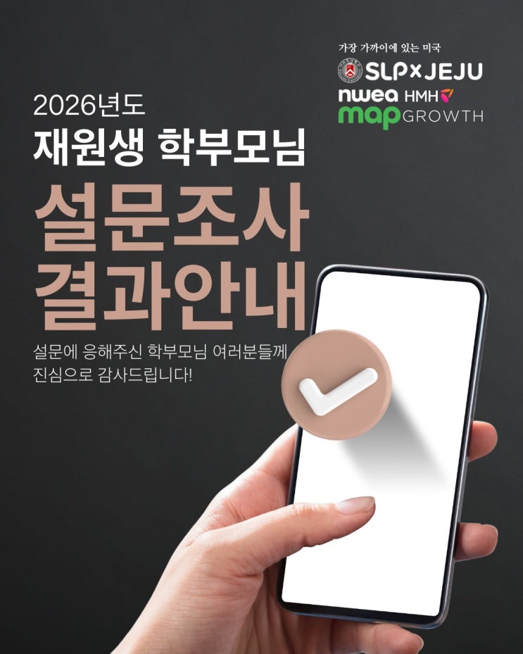 안녕하세요? JEJU SLP 입니다! 지난 2025년 12월 8일부터 약 한 달간 JEJU SLP 재원생 학부모님 대상 설문조사를 진행했습니다 이번 설문은 다양한 경로를 통해 학부모님 여러분들의 의견을 적극적으로 경청하고, 아이들이 보다 편안한 교육환경 속에서 더 높은 수준의 영어수업을 받을 수 있도록 하기 위한 목적으로 실시되었습니다! 너무나도 감사하게도 많은 학부모님 여러분들께서 설문에 참여해 주셨고, 따뜻한 격려와 응원의 말씀들을 남겨주셨습니다. 보내주신 마음에 진심으로 감사드리며, 아이들에게 더욱 최선을 다하겠다는 다짐과 함께 2026년에도 한 걸음 더 성장하는 JEJU SLP 가 되기 위해 노력하겠습니다. 또한 이번 설문을 통해....... <img src="https://blogthumb.pstatic.net/MjAyNjAxMDhfNDQg/MDAxNzY3ODQzNzQ2Nzc1.q9uFvm-hMOULR6BjvGlROFS1xptJSKFUZWZeWvPzs8Yg.V_tV11tAoH8nzA4lJWmS9UG0zxTML0U4Q1rKz4tso8Qg.JPEG/2026_%C0%E7%BF%F8%BB%FD_%BC%B3%B9%AE%C1%B6%BB%E7_%B0%E1%B0%FA_%BE%C8%B3%BB.jpg?type=s3" />